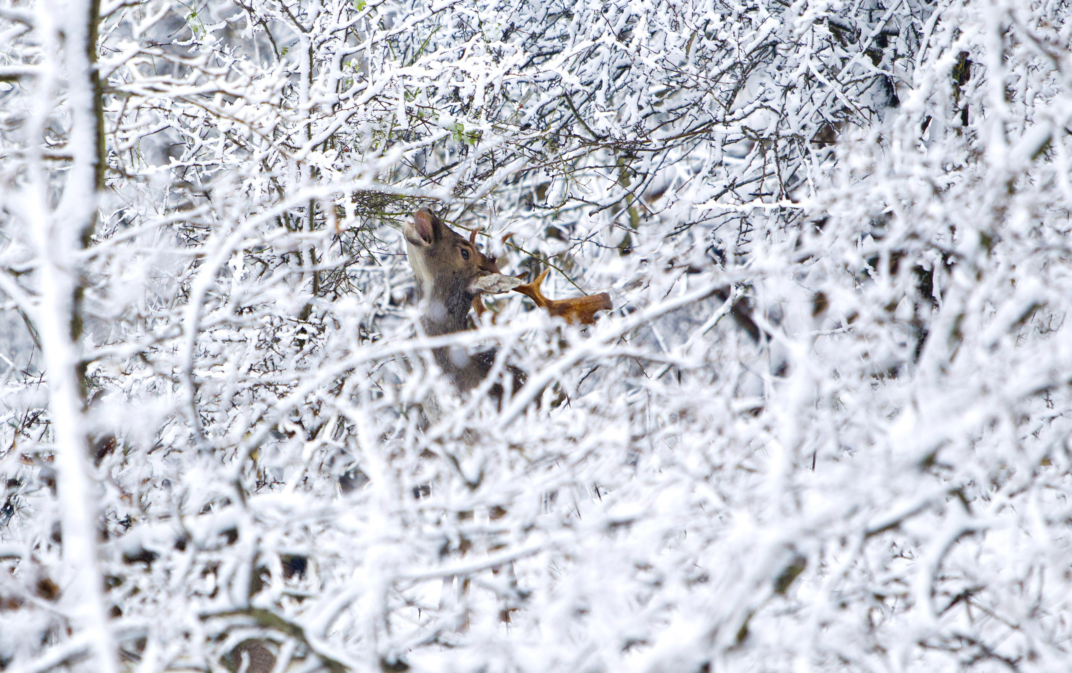 Tussen alle besneeuwde bomen in de amsterdamse waterleidingduinen nabij zandvoort zoekt dit hert naar de paar groene blaadjes aan de bomen die nog te vinden zijn.