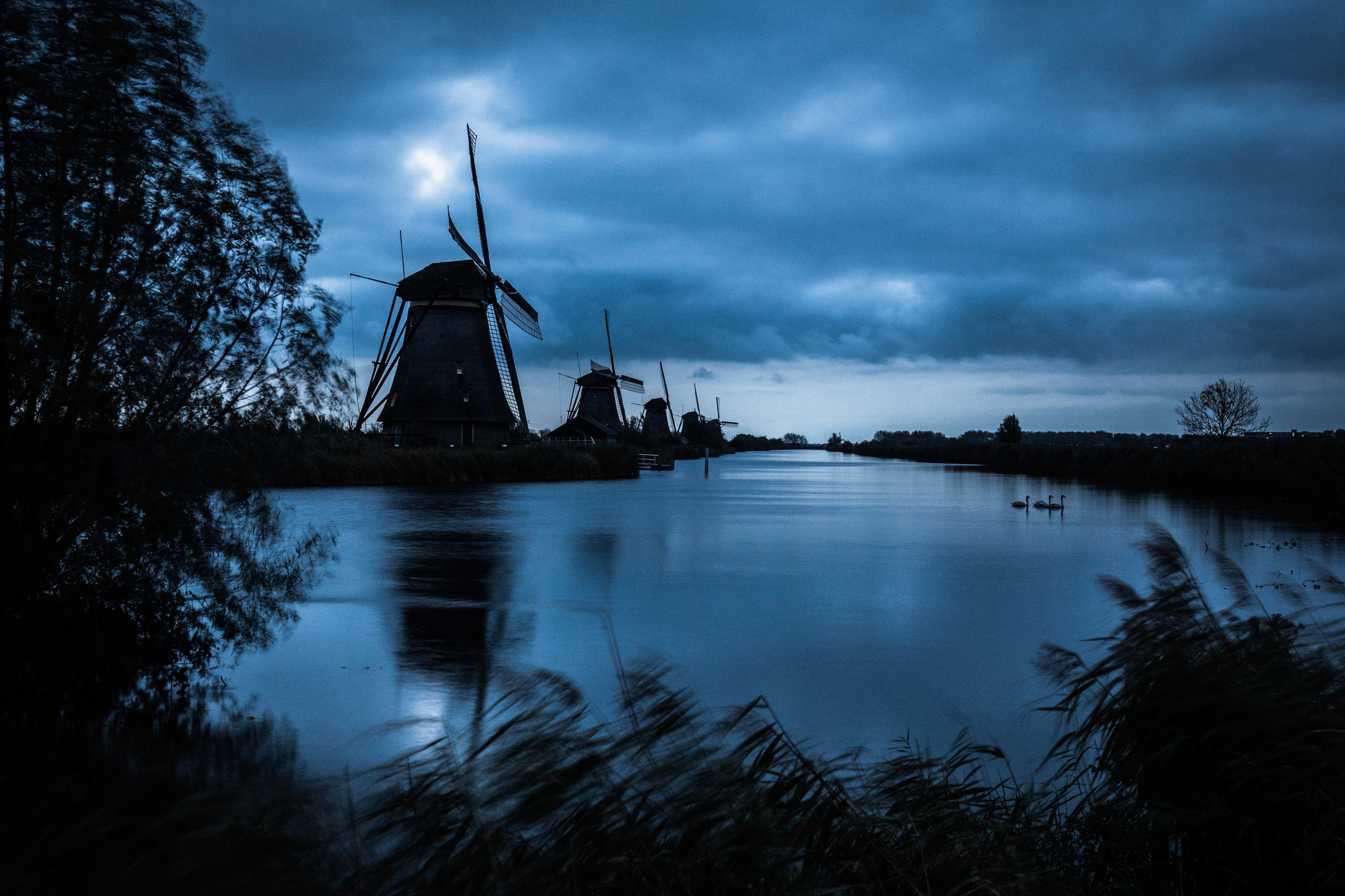 Kinderdijk bij zonsopkomst op een bewolkte dag.