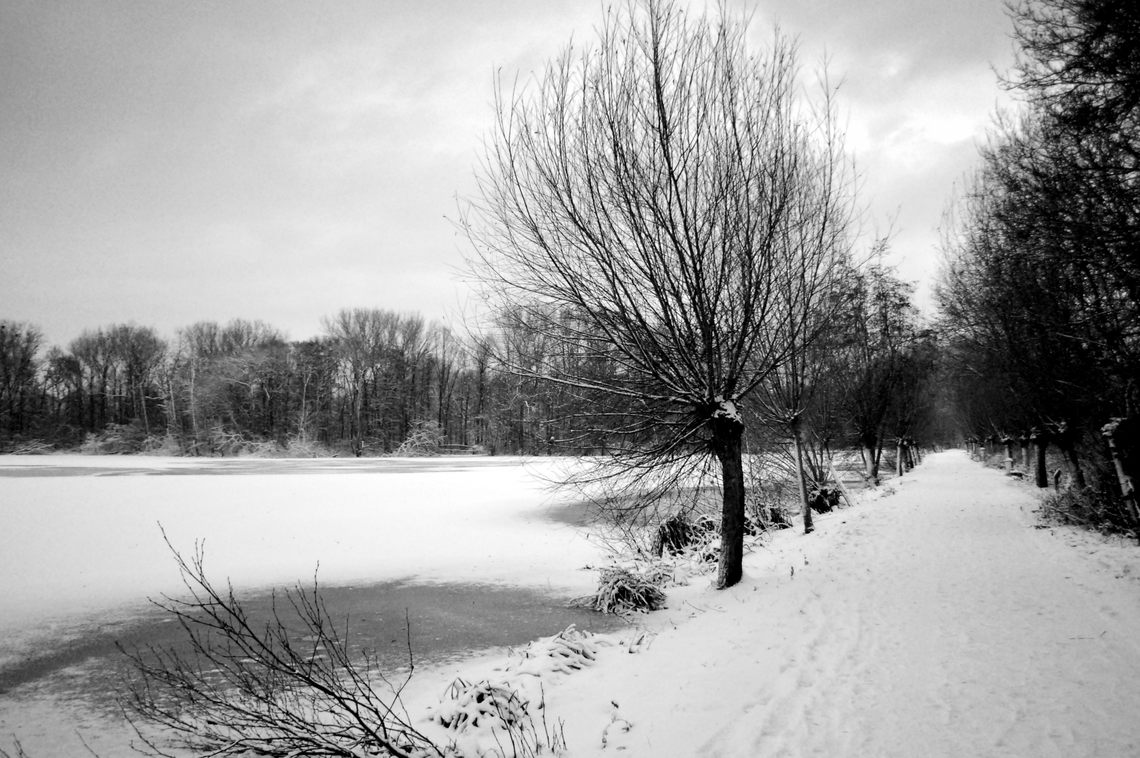 Het besneeuwde wandelpad naar de Eendekooi bij het donkmeer.