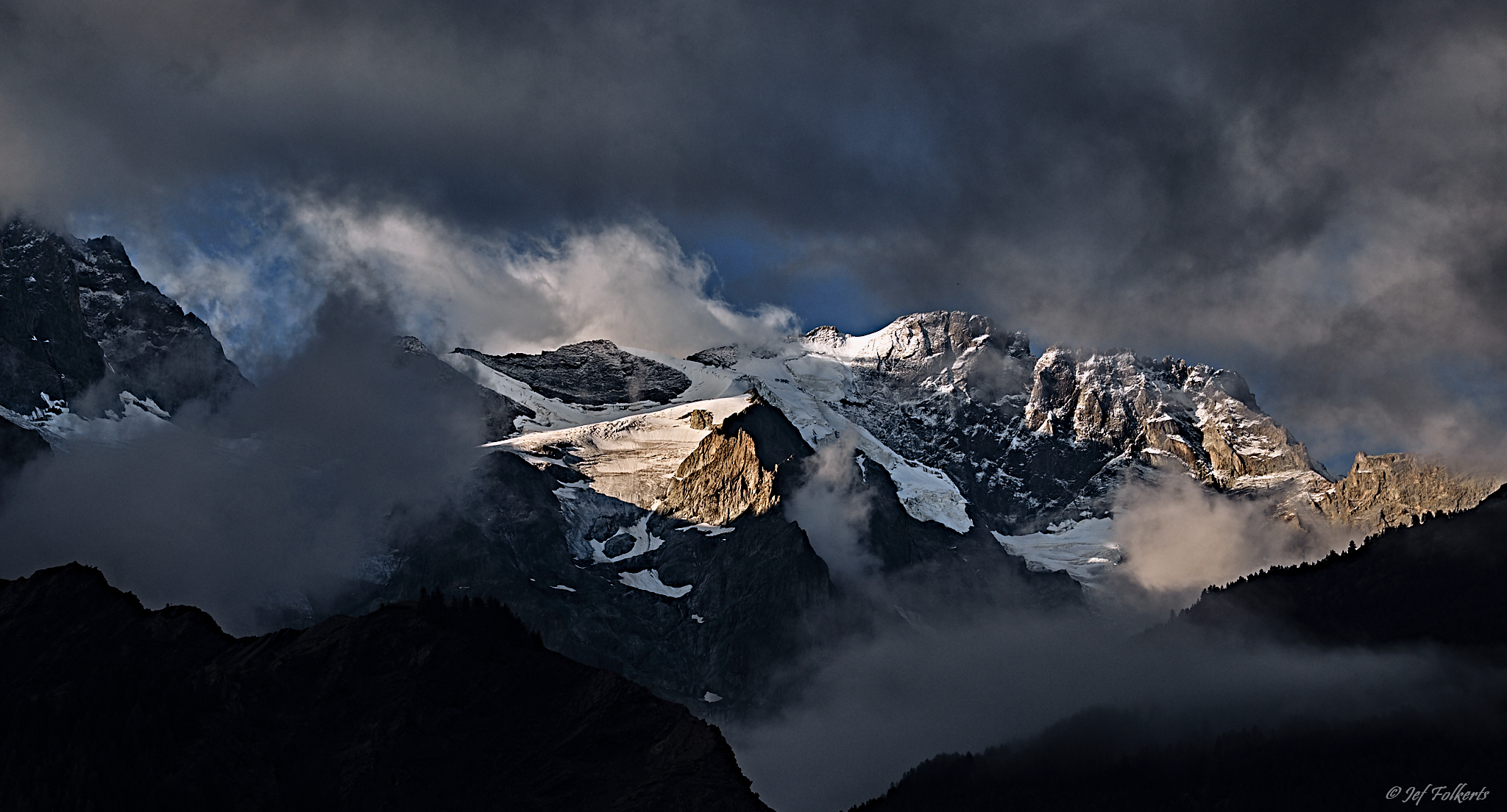 Na een flinke storm 's nachts toont bergmassief De La Meije bij La Grave in de Franse Alpen zich bij het eerste zonlicht in zijn overweldigende pracht en praal.