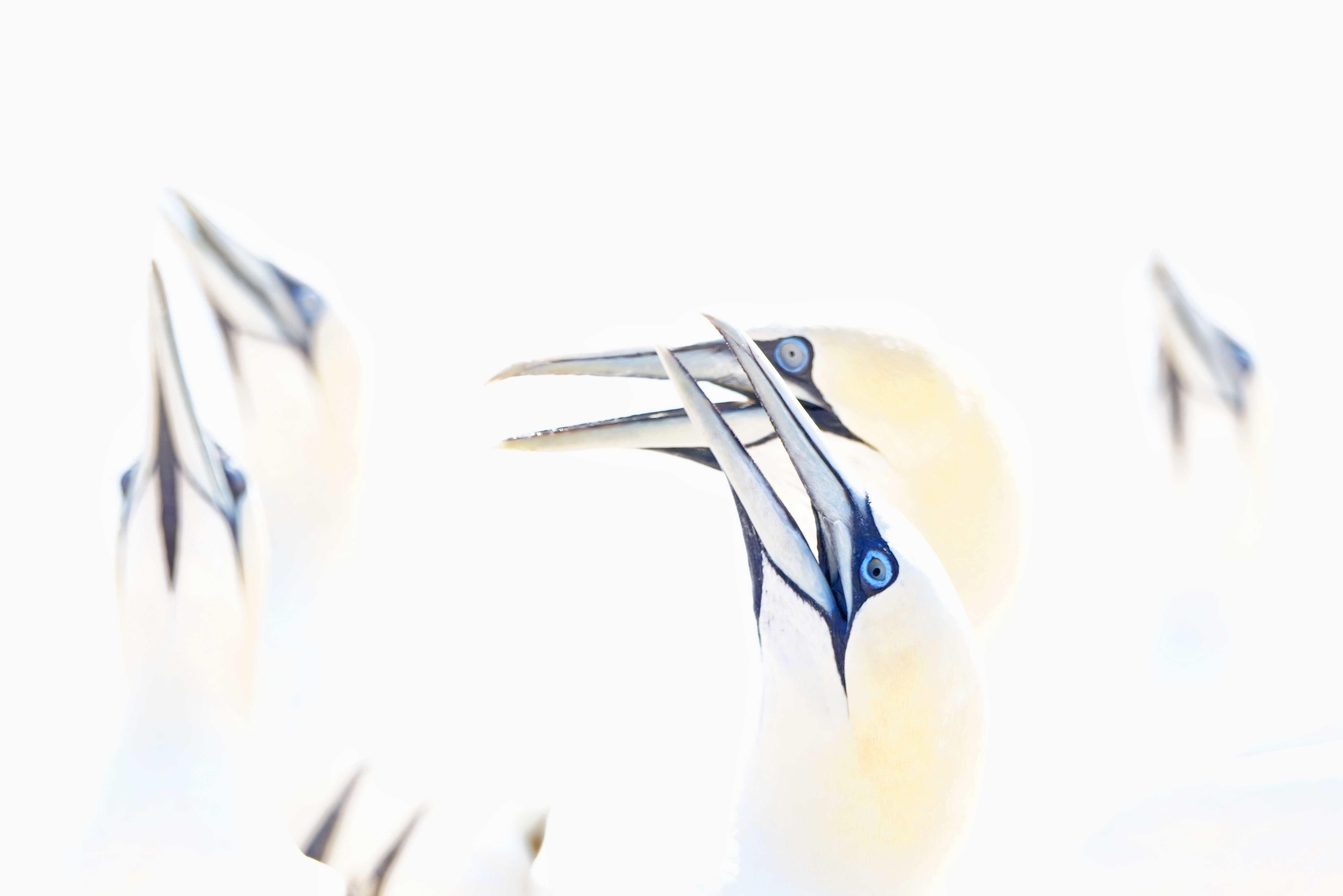 Chaos op de klif in Helgoland. De vogels hadden erg last van de warmte en zaten daarom veel met hun snavel in de lucht