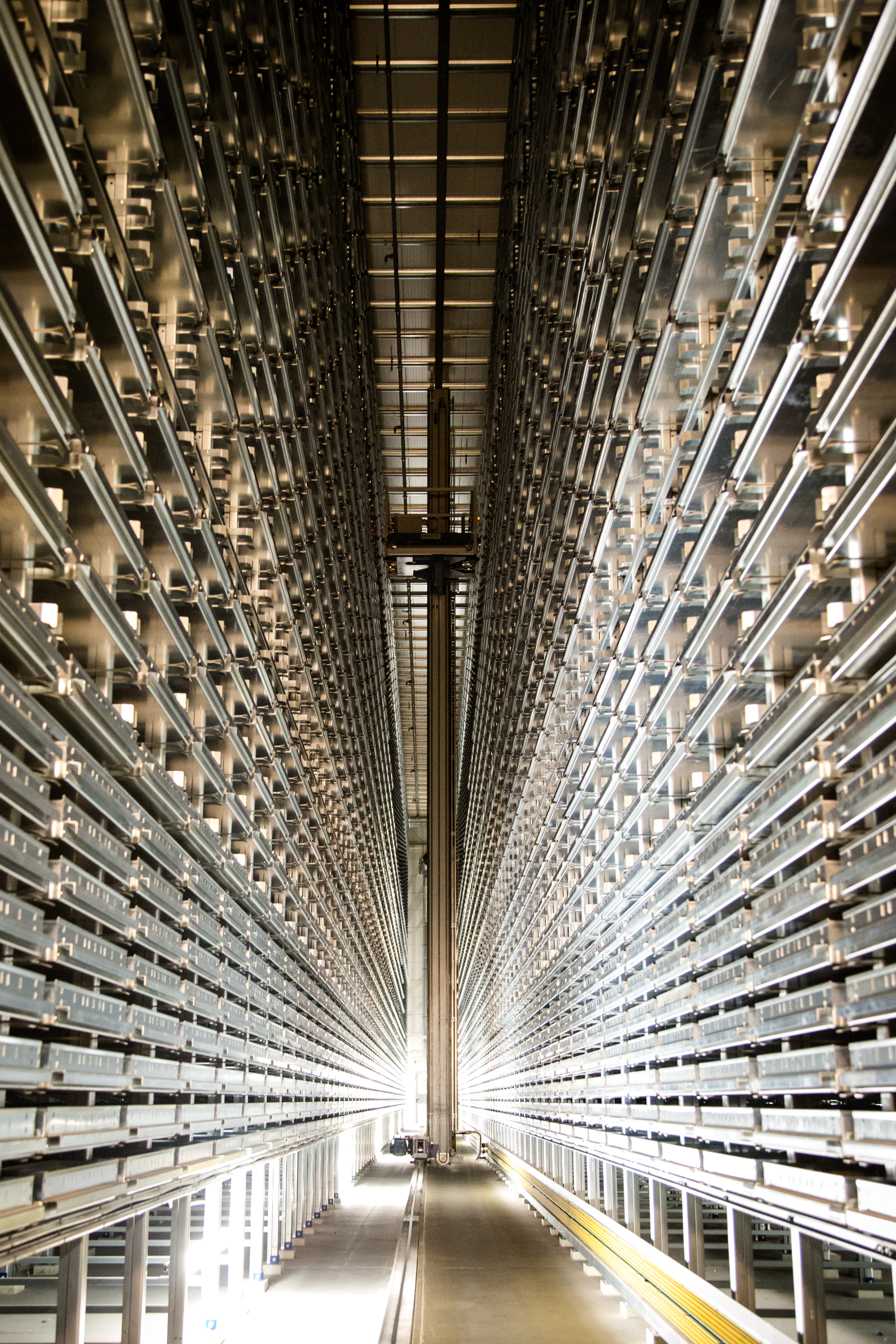 Deze science fiction achtige foto is gemaakt in Nederland en wel op de vliegbasis Woensdrecht waar een volledige gedigitaliseerd magazijn te vinden is van Luchtmacht vliegtuigonderdelen, waaronder de F-35 (JSF). De verticale staander in het midden heeft een soort grijper en een mandje (zichtbaar vrijwel bovenin) en wordt volledig geautomatiseerd aangestuurd en pakt zelfstandig onderdelen uit de honderden vakjes.
