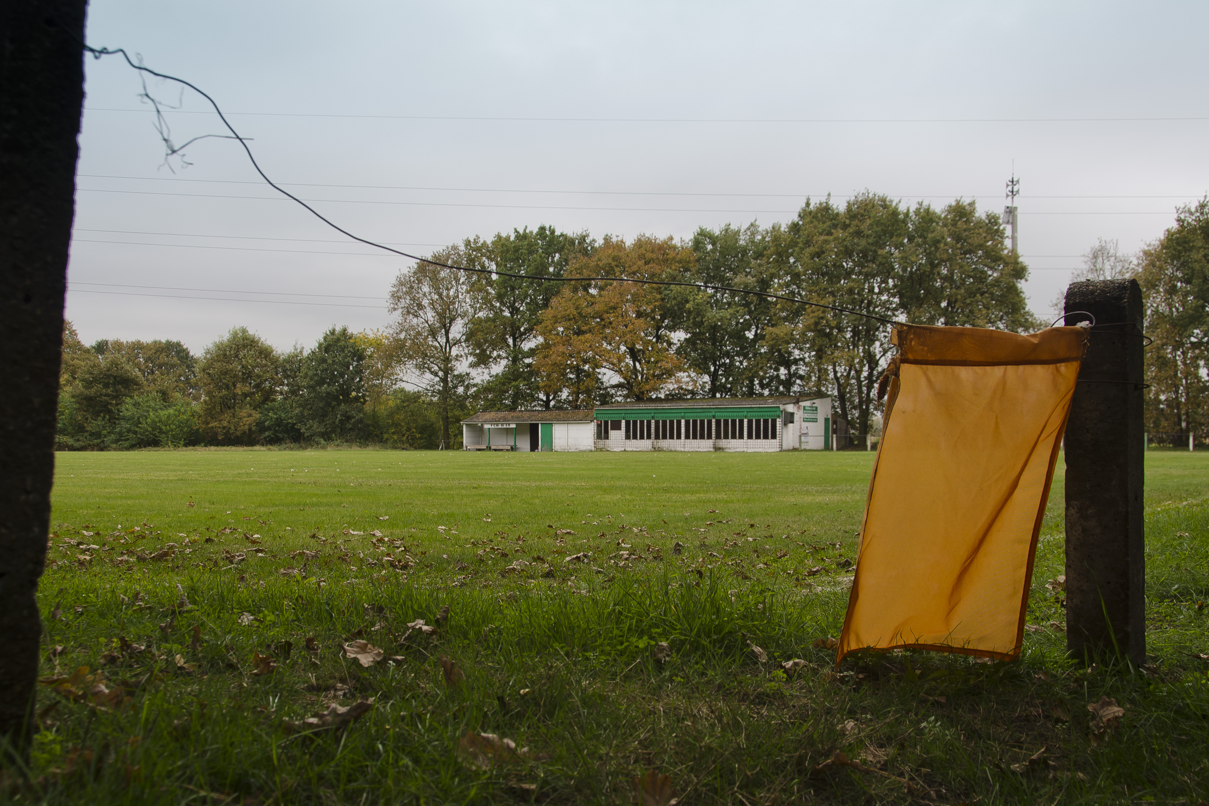 De hoekvlag, vastgemaakt aan wat ooit de omheining vormde van het voetbalveld, in de buurt van Kasterlee, België. Van de voetbalvereniging F.C.M. Bier.