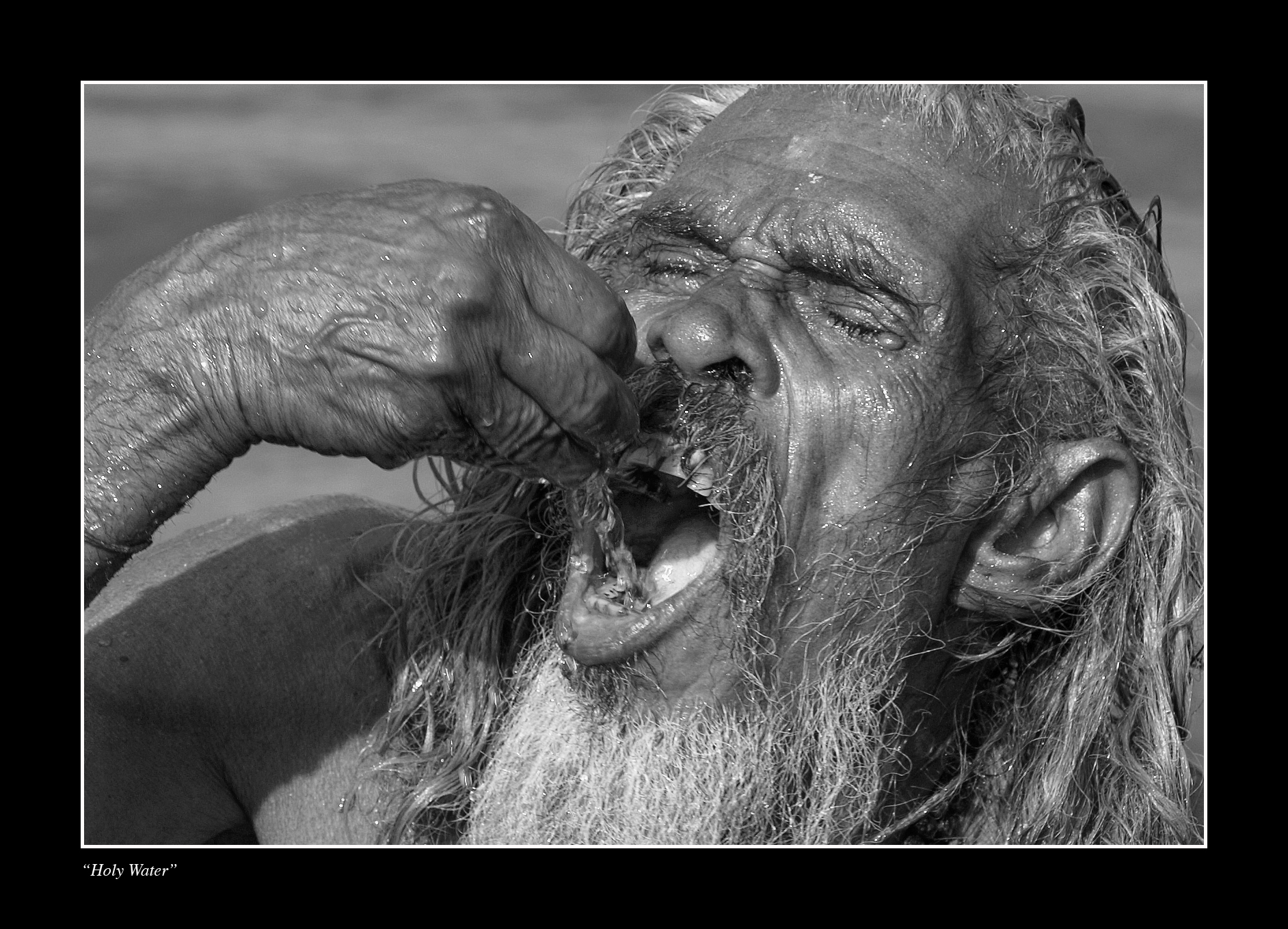 Man drinkt water uit de heilige Ganges-rivier in Haridwar, NW-India.