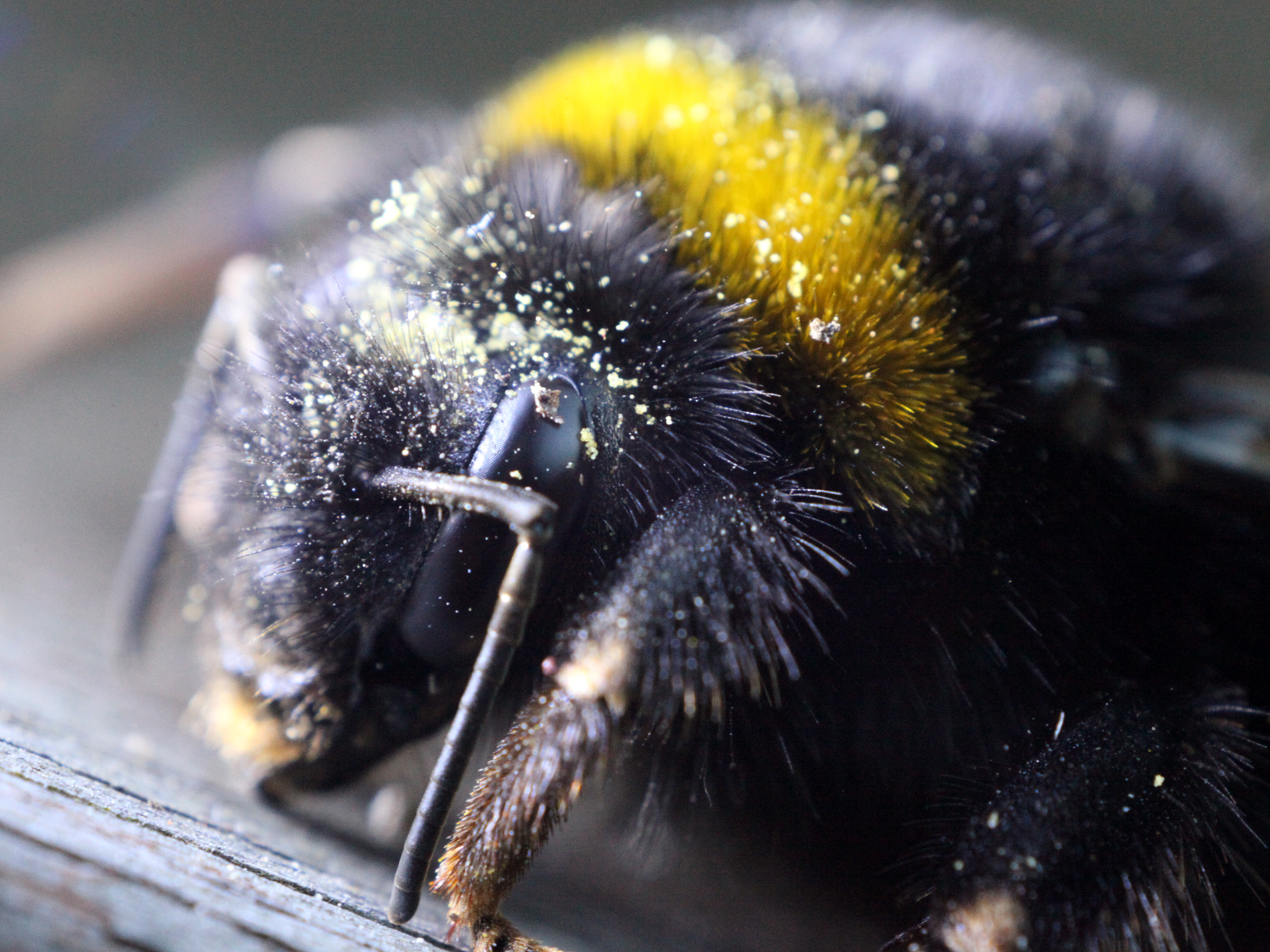 De foto van deze hommel is gemaakt met een balg (uittrek +/- 30 cm) en vergroter-objectief (Photar 1:2.8/50) op een EOS 5DII.