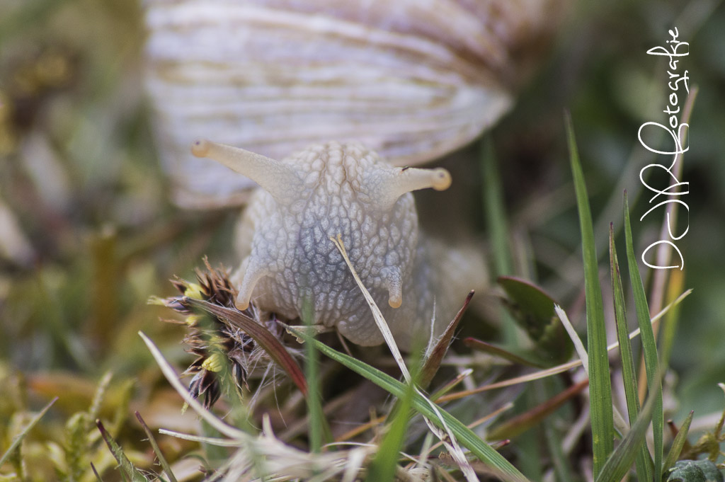 Close up van een hongerige slak die aan het smullen is.