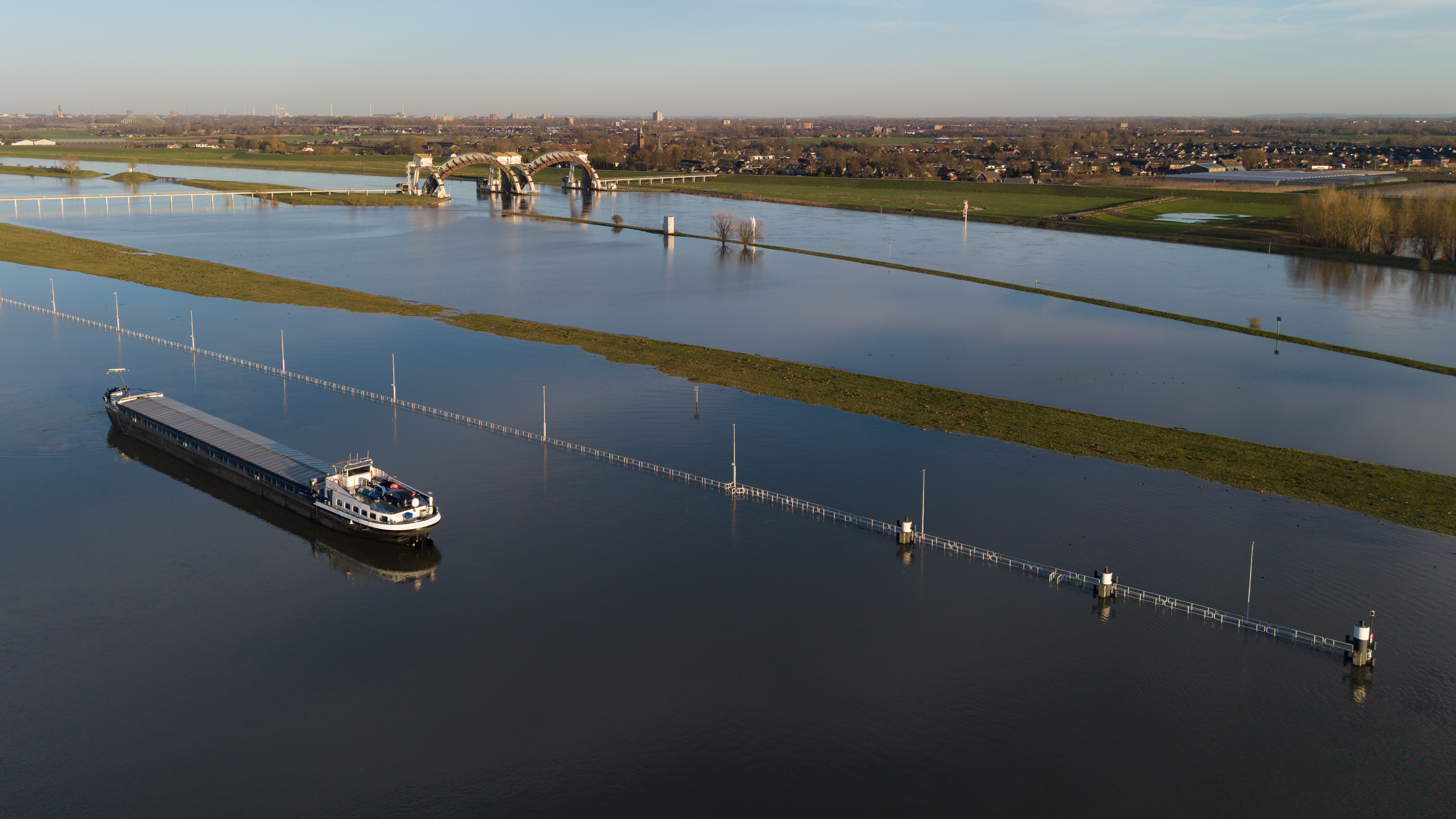 Hoog water in de Nederrijn bij het stuw- en sluizencomplex ter hoogte van Driel (Gld).