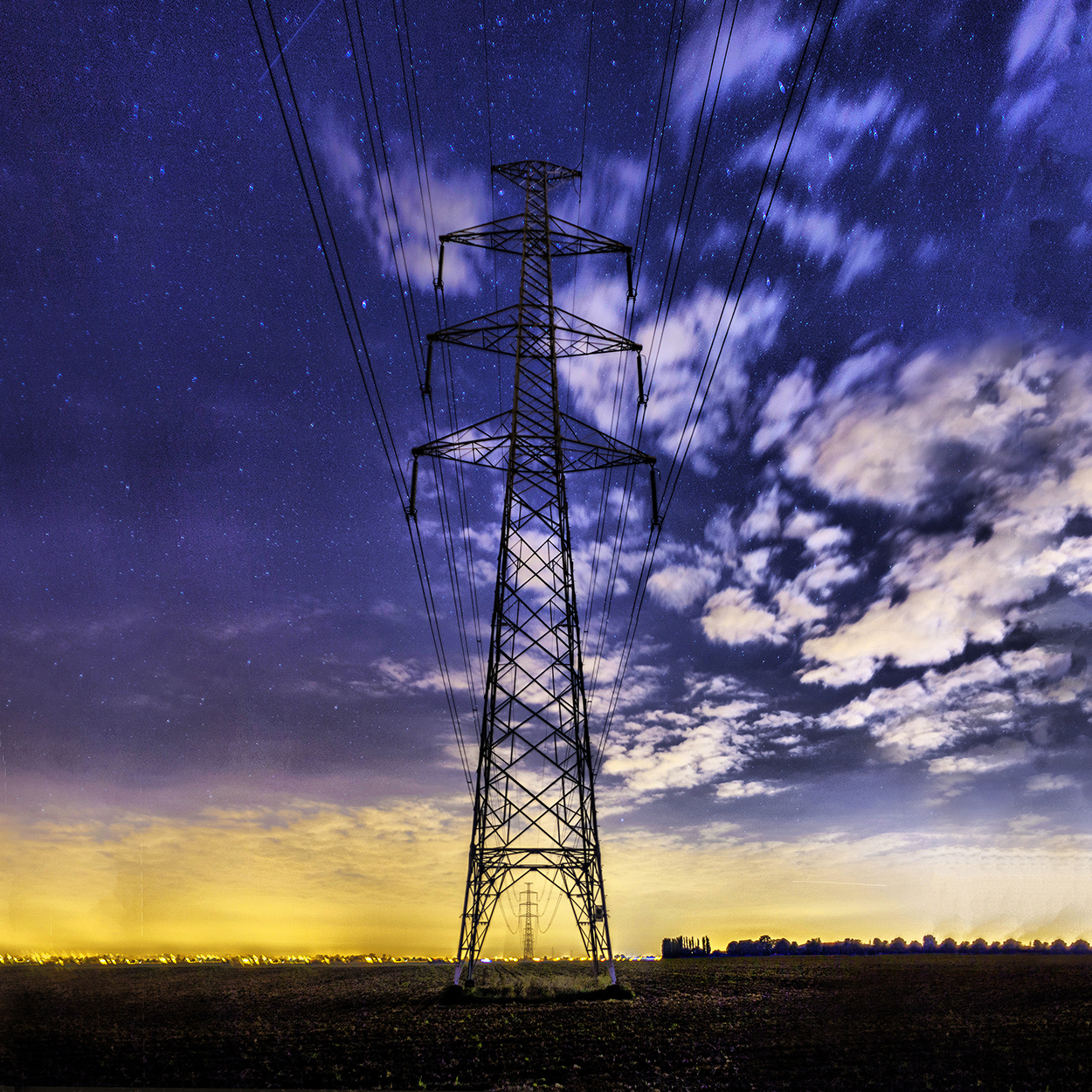 Panorama van 3 foto`s van een hoogspanningsmast ergens in Wallonië. Op zoek naar een locatie zonder lichtvervuiling, maar niet gevonden. Links is de enorme lichtvervuiling van de E40 snelweg naar Brussel te zien, rechts die van de stad Luik.