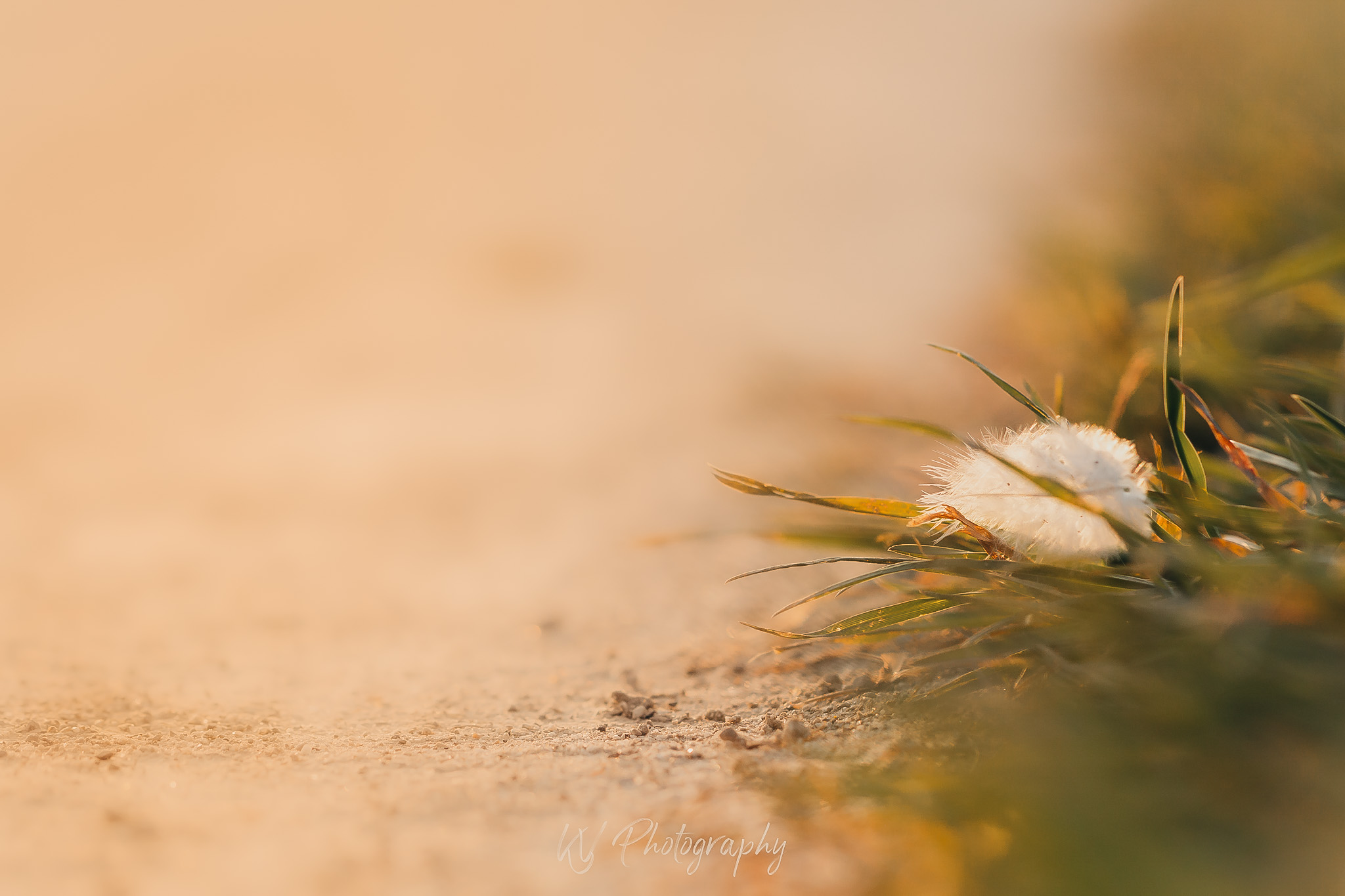 Van de kleine dingen genieten. Een veertje in de kant van de weg tijdens golden hour.