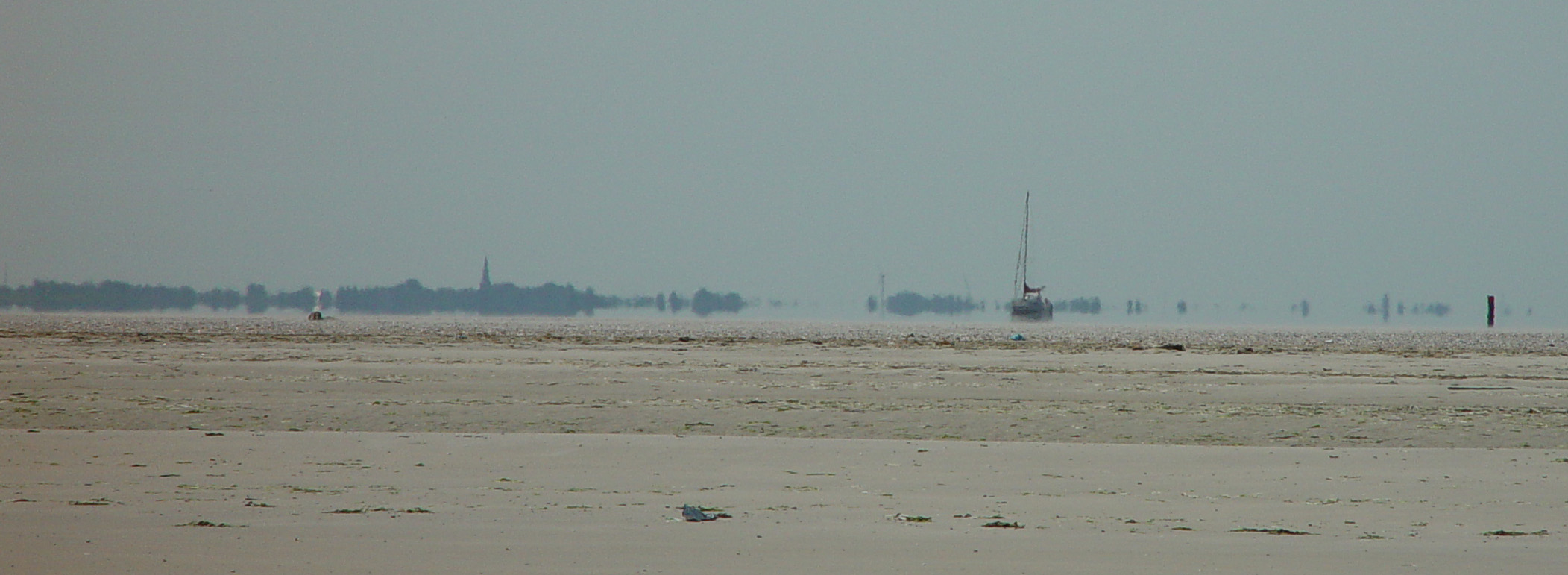 Vanaf het Noordzeestrand op de zandvlakte van de Hon op Ameland zie je zo over de Waddenzee heen naar de "Sky-Line" van de Vaste Wal bij Holwerd. Je ziet de contouren aan de horizon van de bossen en de kerk van Holwerd, een boei in de stroming, een verlaten boot op de Waddenzee en een laatste strandpaal. Dat alles op afstand door een warme luchtlaag heen, wat een typisch "blurring" effect oplevert.