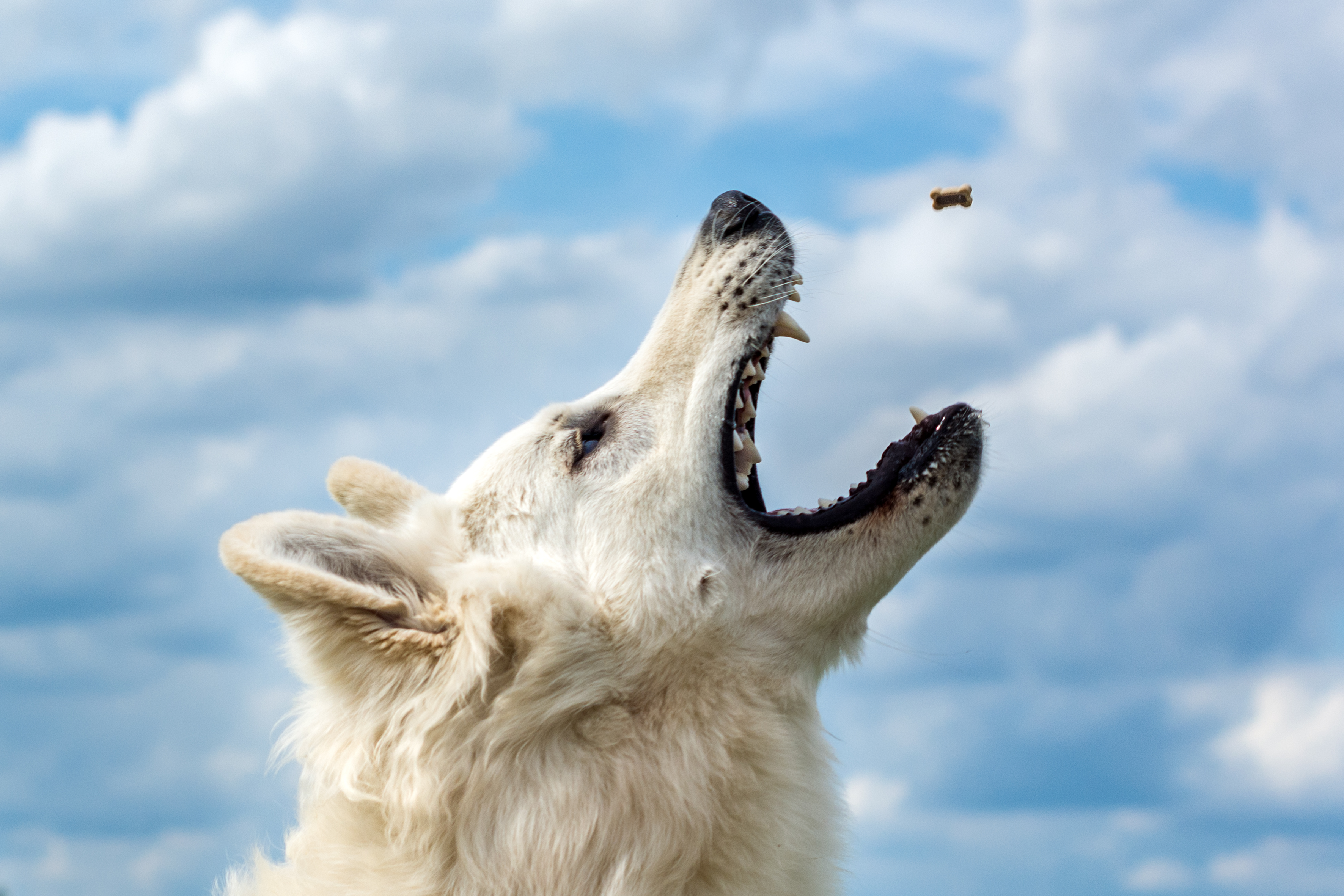 Deze witte herder zijn naam is Pepijn en klaar om zijn snoepje in ontvangst te nemen.