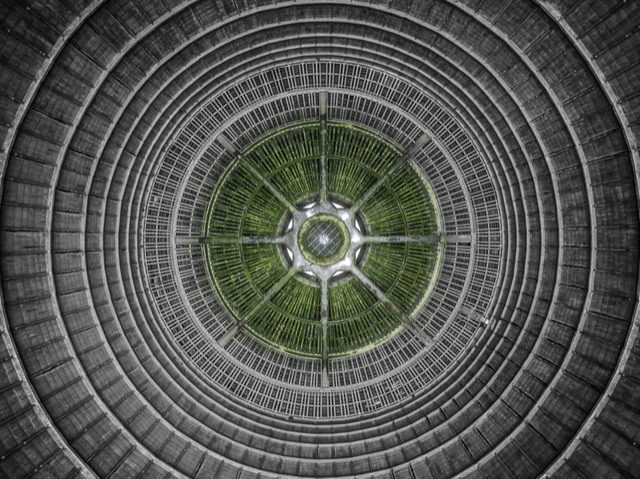 Bovenaanzicht van in een verlaten koeltoren (60m hoogte).