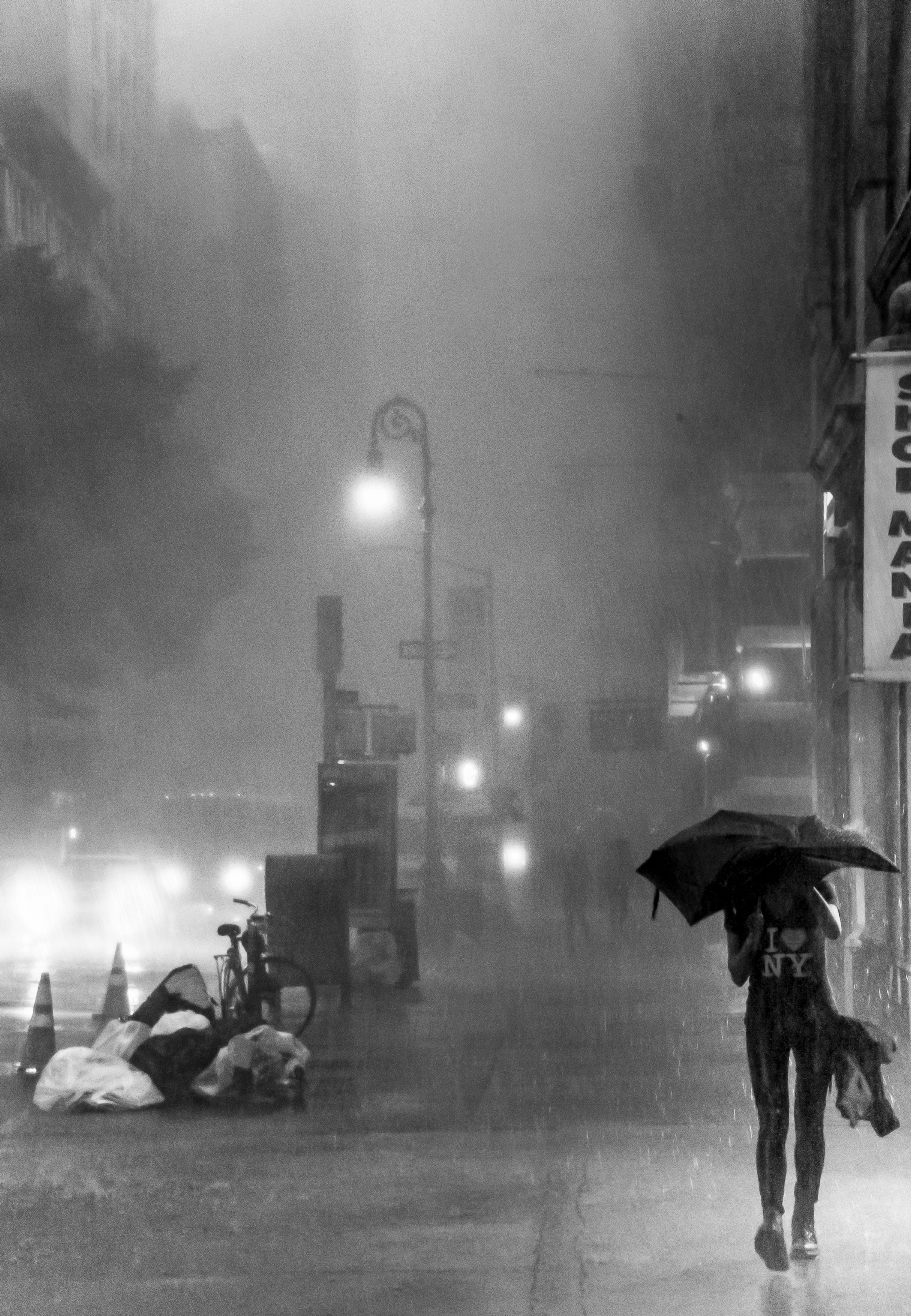 Ik liep op een mooie dag door de straten van New York City toen er opeens uit het niets een enorme wolkbreuk was. De persoon hier in beeld was net als ik niet voorbereid op deze plensbui, maar zag toevallig een weggegooide paraplu tussen het afval liggen en maakte daar dankbaar gebruik van. Misschien is dat waarom hij zo van New York lijkt te houden? (zie T-shirt). Of is het vooral ironisch?