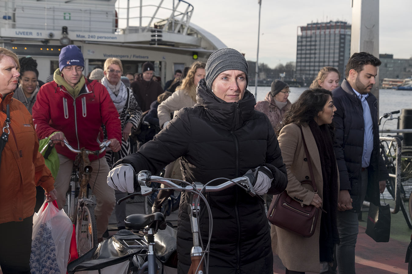 Mensen verlaten het IJpontje na een werkdag
