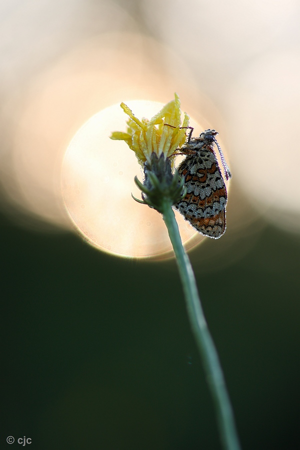 Een veldparelmoervlinder in de opkomende zon.