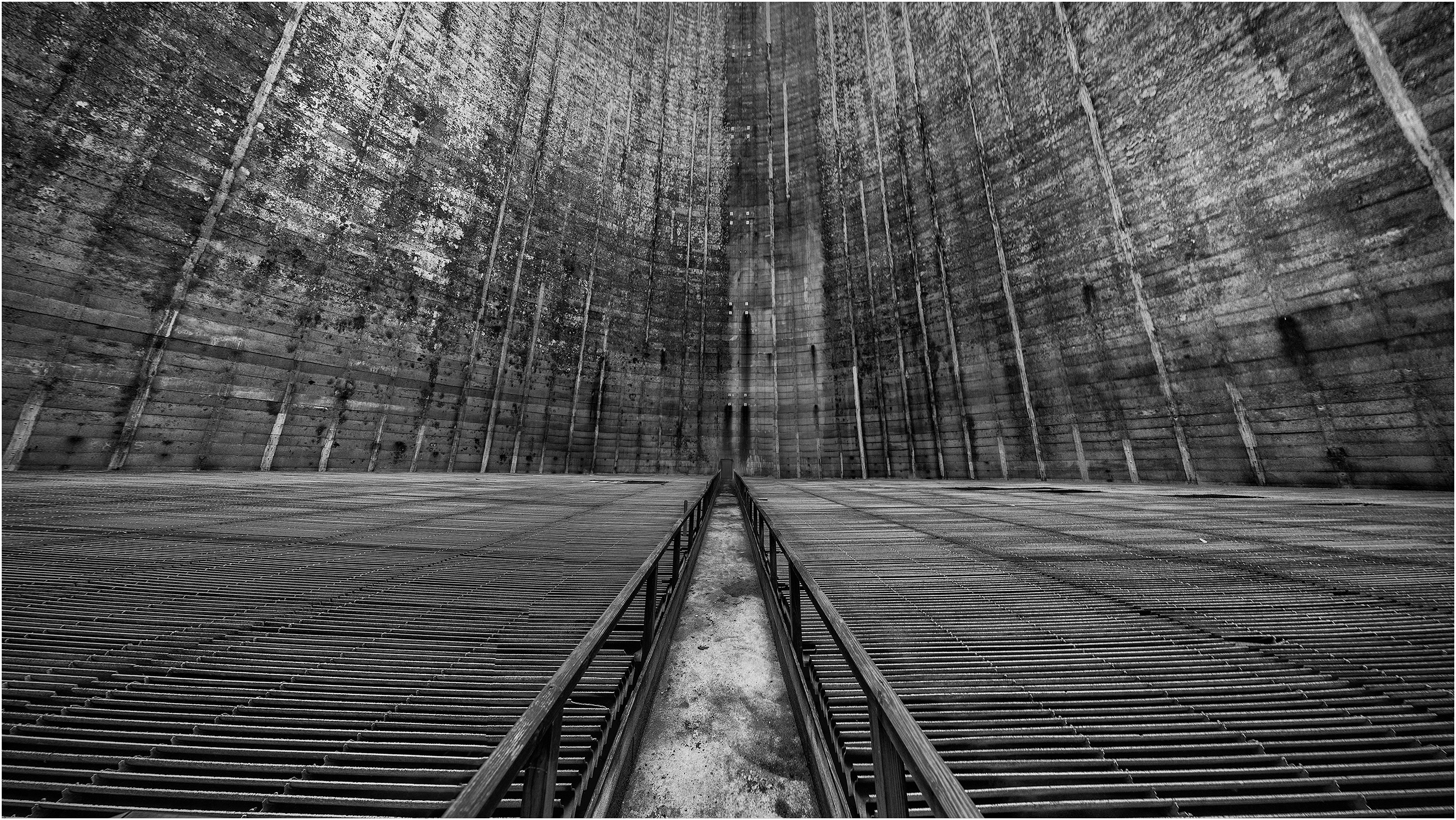panorama van 23 foto`s van de binnenkant van een verlaten koeltoren van een elektriciteitscentrale