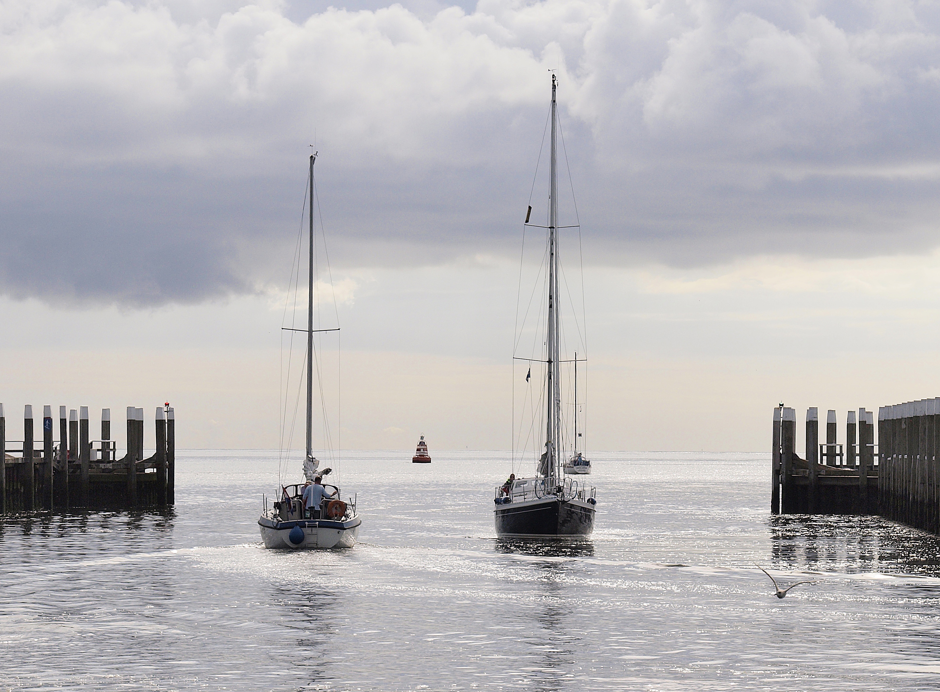 Oudenschild Texel heeft een mooi haventje. Deze twee bootjes waren een echte blikvanger, want hoe dikwijls zie je 2 boten samen in tegenlicht in en uit de haven varen.