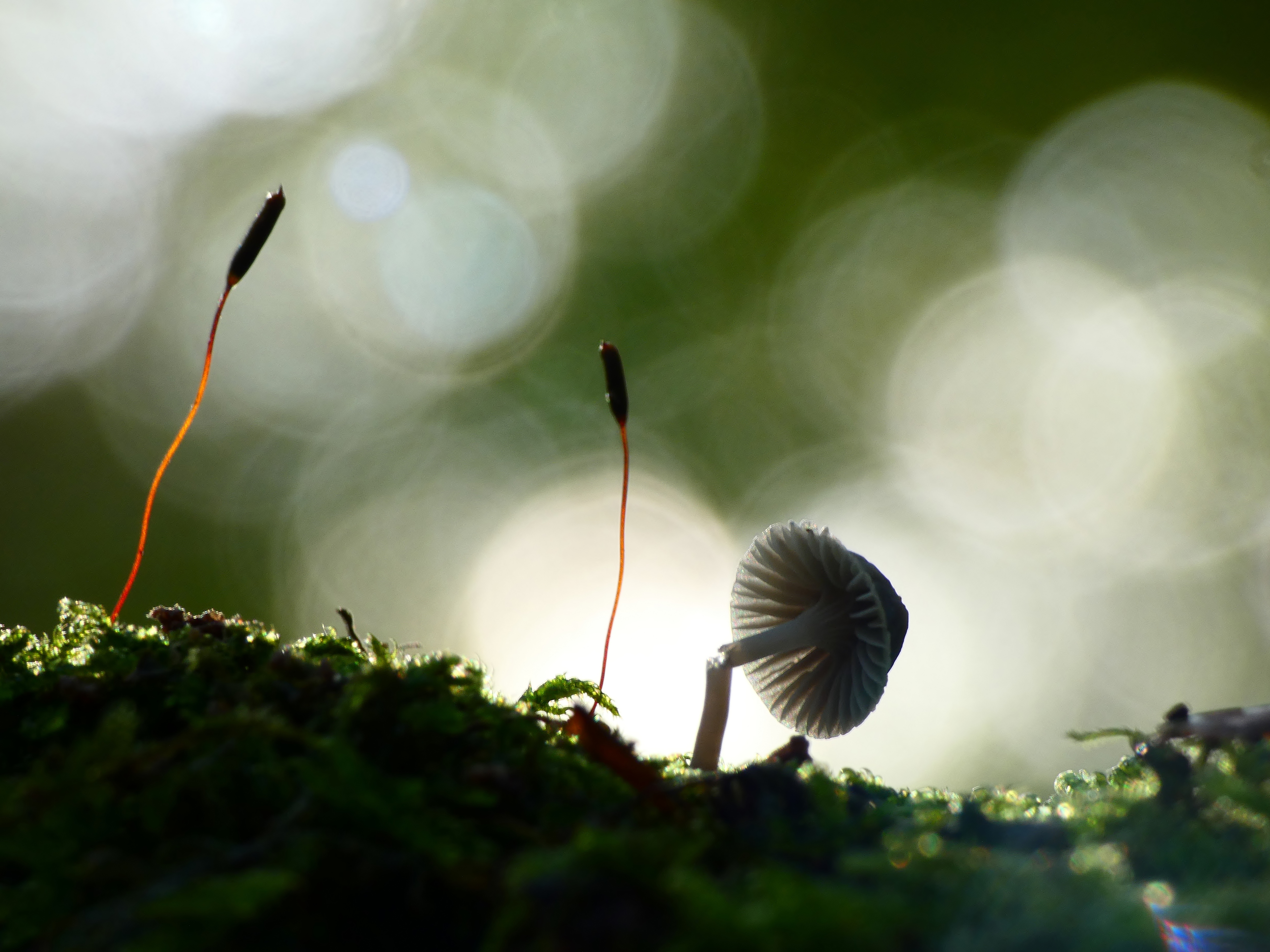Het zonlicht viel tussen de bladeren door op het paddenstoeltje.