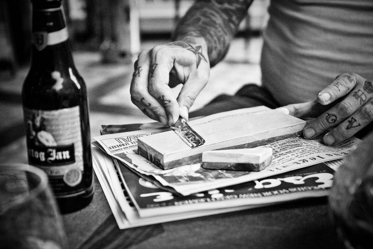 Honing their straight razors themselves, the way it's supposed to be...