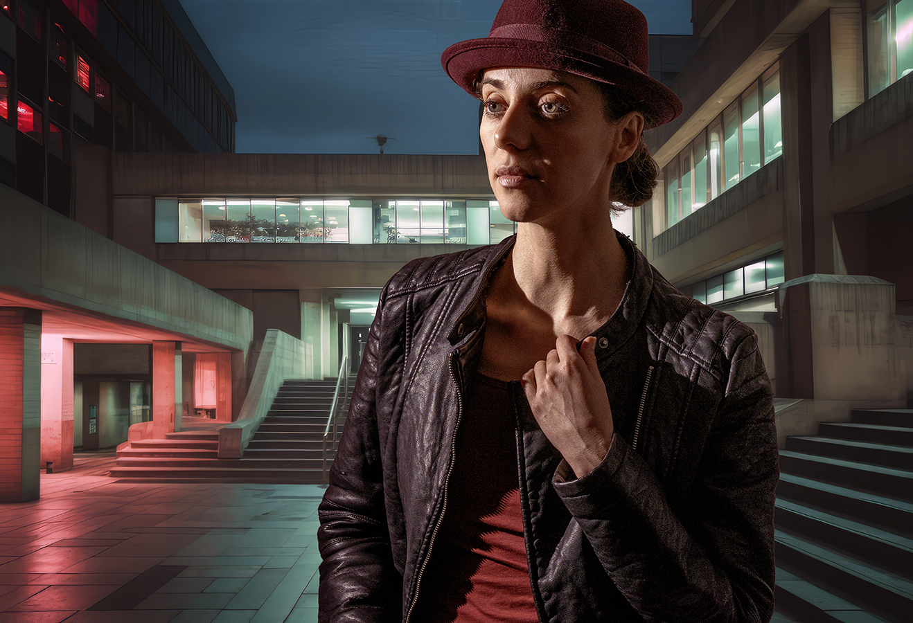 Vrouw in lederen jack op de binnenplaats van een gebouwencomplex, avondsfeer