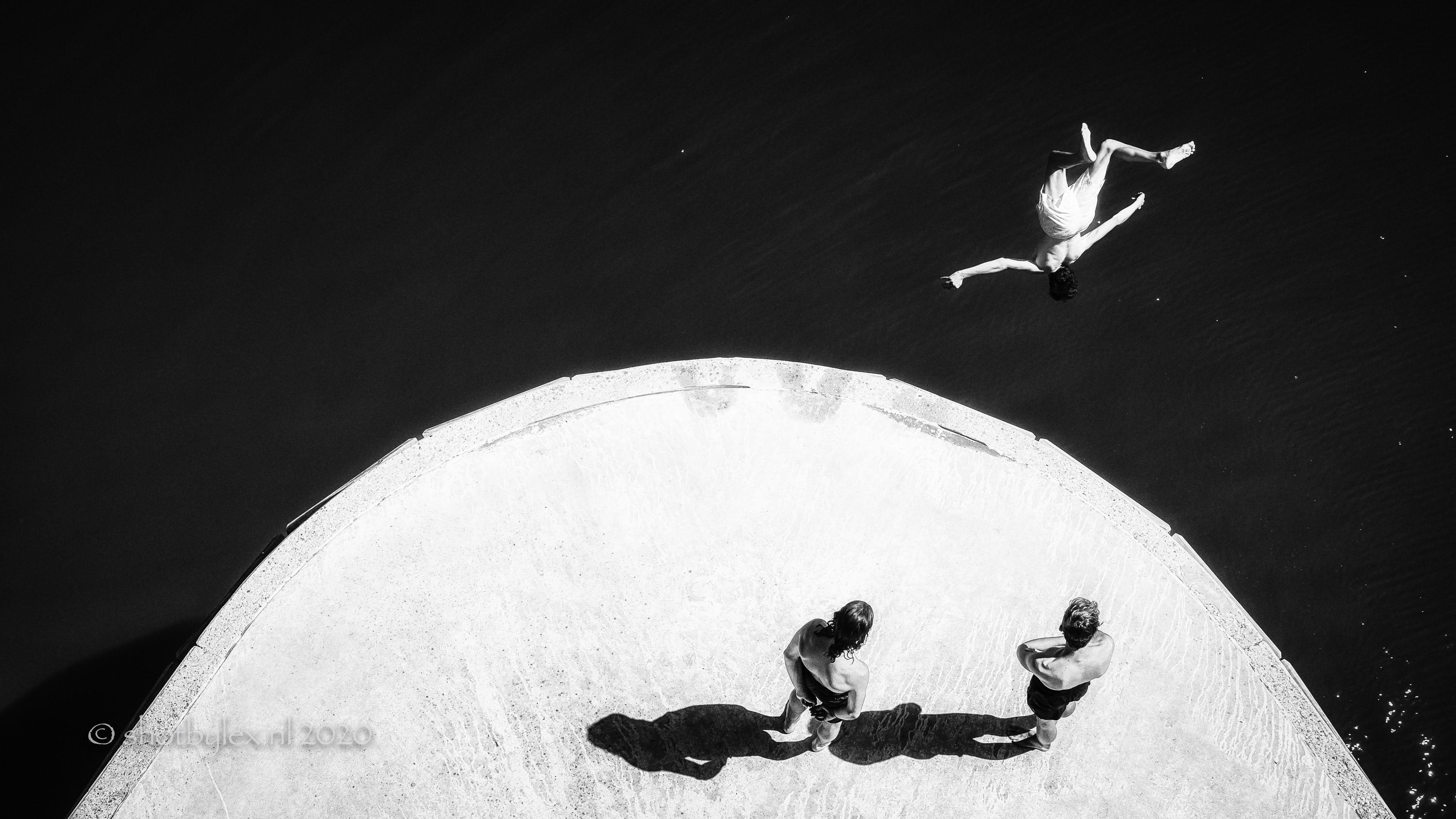 Als het warm is zijn er altijd wel waaghalzen te vinden die vanaf de brugpijlers de de Spiegelwaal, bij Nijmegen, in duiken. Vanaf de fietsbrug heb je op groote hoogte mooi zicht op dit schouwspel. Heerlijke verkoeling op een warme dag.