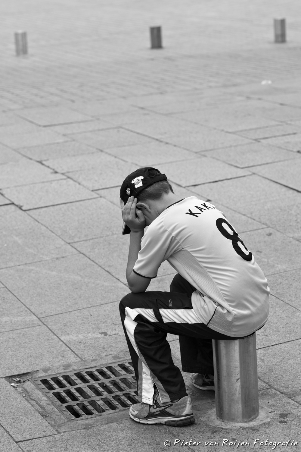 Een kleine jongen met het shirt van de Braziliaanse voetballer Kaká (Ricardo Izecson dos Santos Leite Faiz) zit verdrietig (of boos) op de Place Vendôme in Parijs. Wat is er zojuist gebeurd dat hij zo verdrietig is..?