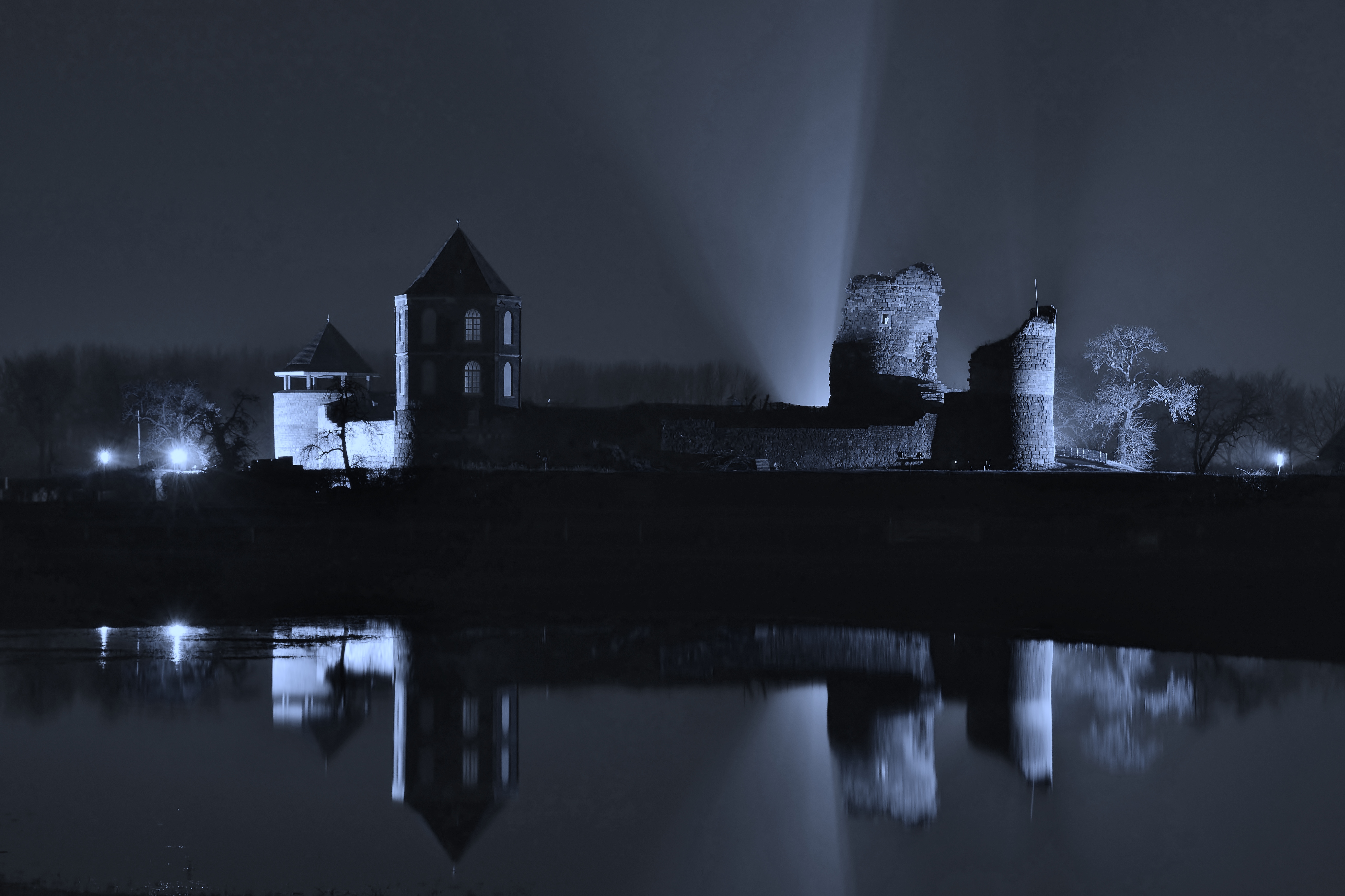 Afgelopen week voor het eerst bezig geweest met avond/nachtfotografie. Dus nu ook in eigen dorp, deze prachtige locatie, ook maar eens vast gelegd. Ik had geluk dat het vrijwel windstil was, waardoor de het water in de poel rimpelloos was en er een mooie reflectie in het water was. Ik heb de foto van kleur omzet naar blauwtonen om het kasteel een wat mysterieuzer aanzicht te geven.