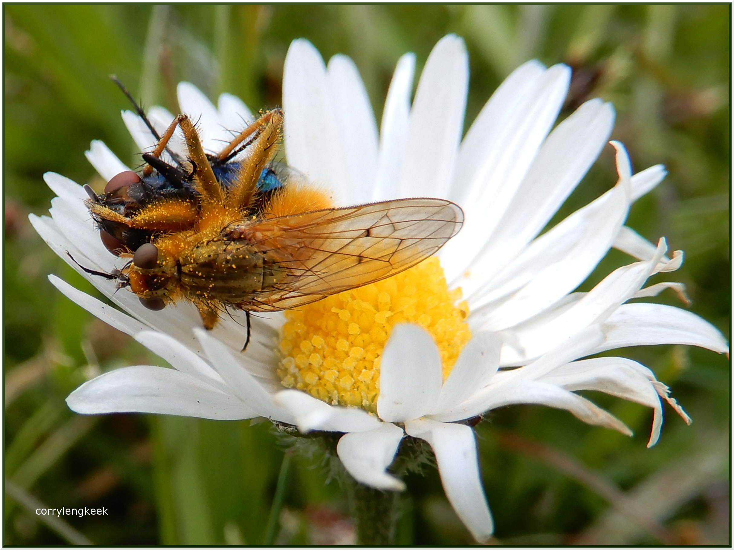 Keizersvlieg in dodelijke greep van strontvlieg