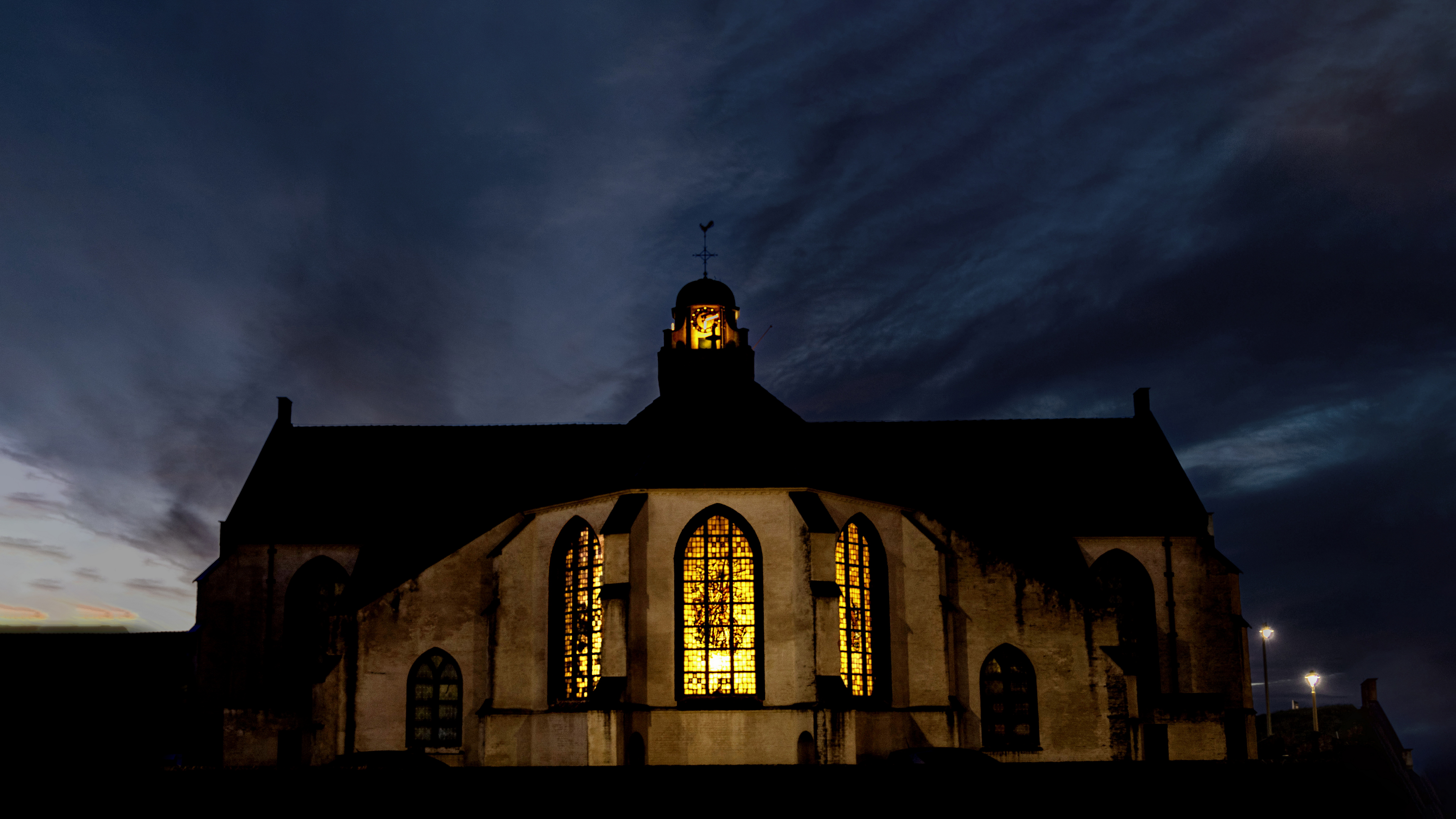 Als het donker wordt en binnen de lichten aan gaan.