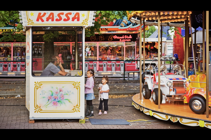 In deze foto (die onderdeel uit maakt van een serie) heb ik de sfeer op een kermis geprobeerd te vangen en dan vooral de ongeinteresseerde houding van de mensen achter de kassa dat in hard contrast staat tot het plezier dat de kinderen hebben op een dergelijke attractie.
