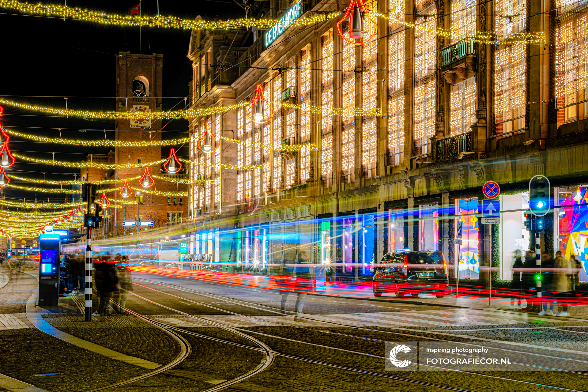 De beurs van Berlage, het imposante gebouw van de bijenkorf en een miezerende avond vol lichtjes aan het einde van de decembermaand.