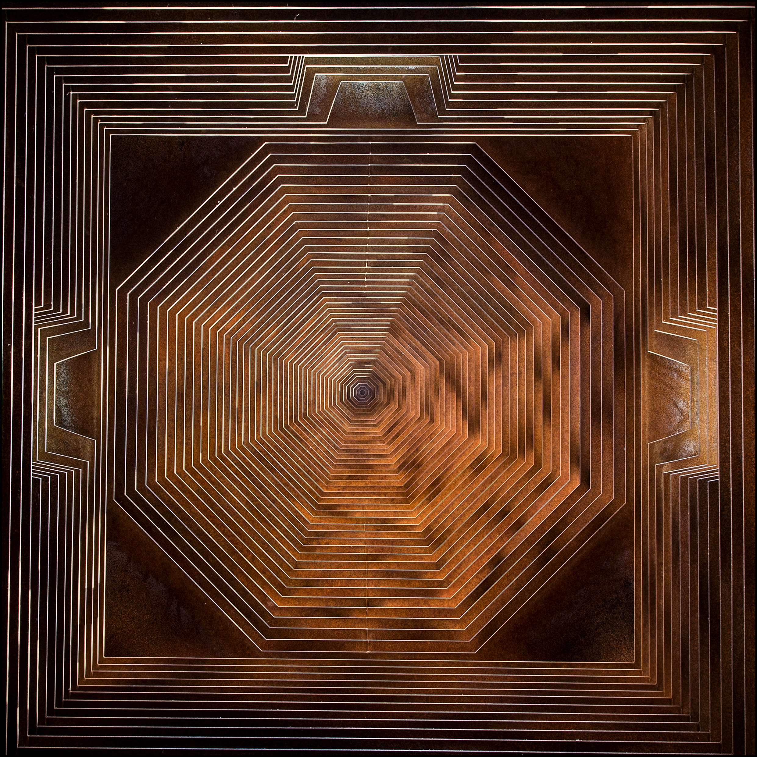 Spits van het doorkijkkerkje in Borgloon, lange sluitertijd en 90 graden omhoog gekanteld vanaf de grond. Perspectief van de lagen metaal komt nu bijna onherkenbaar naar voren.