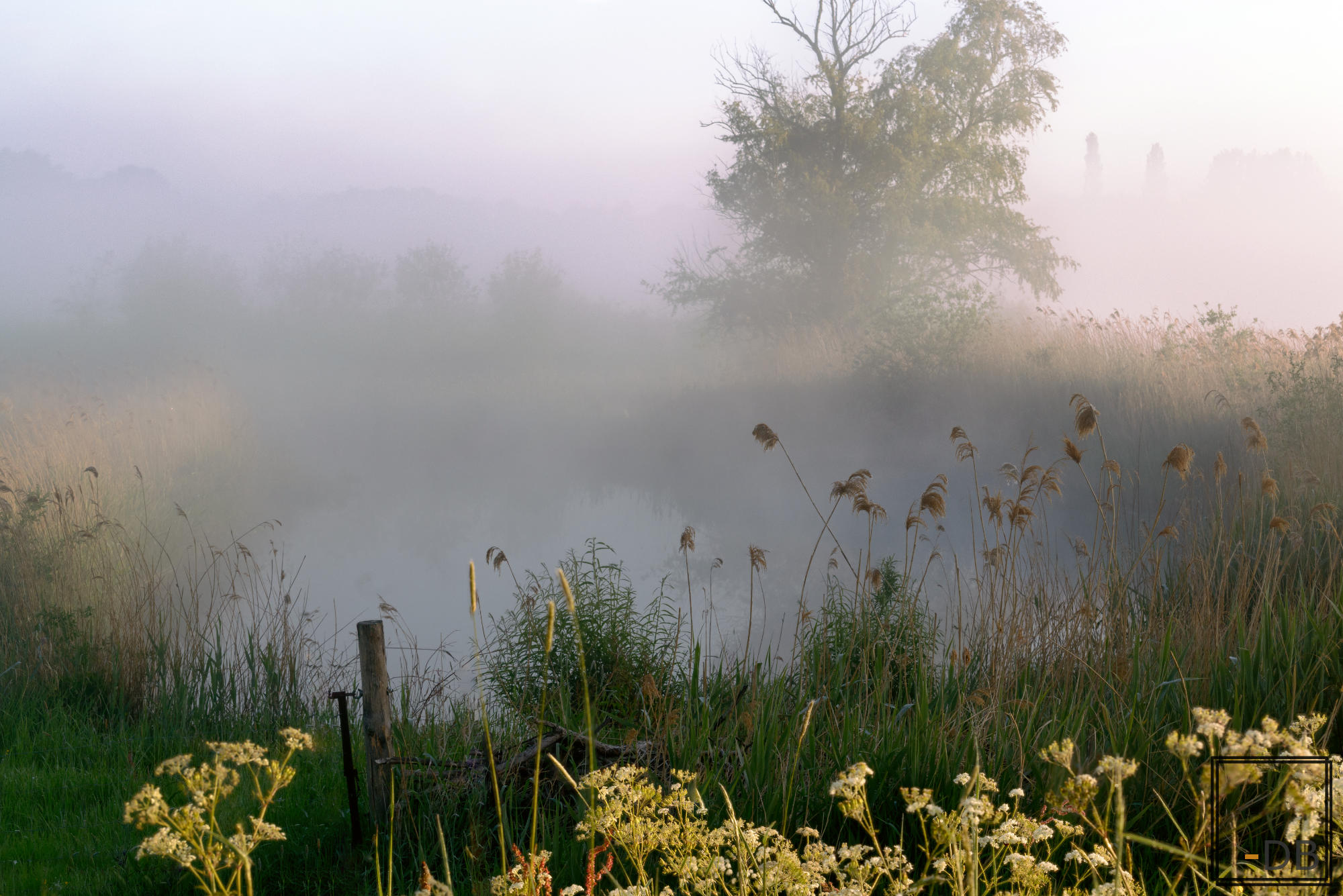 Deze foto is genomen vanaf het hoger gelegen jaagpad met het fluitenkruid al in volle zonlicht. Ik vond dat dit wel een mooi contrast opleverde.