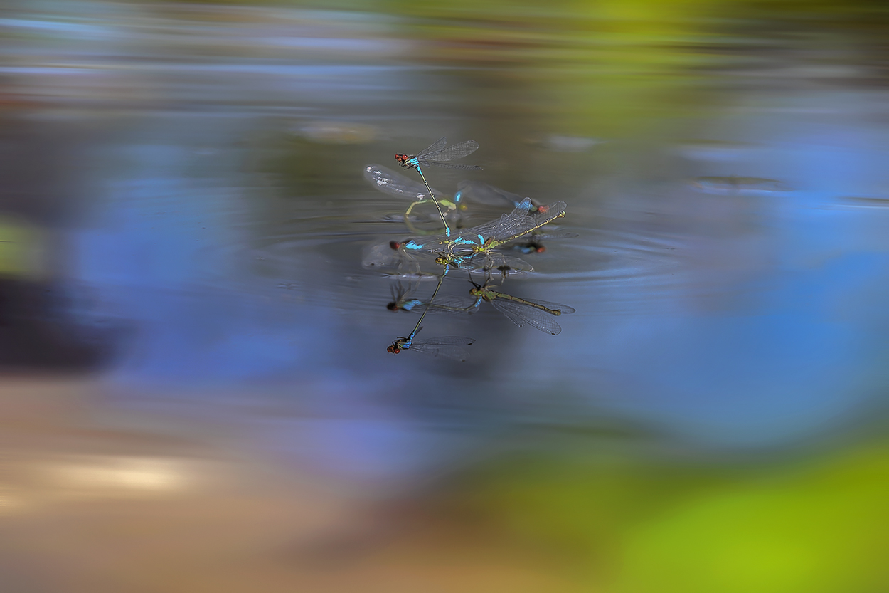 Terwijl de sowieso kleurrijke roodoogjuffertjes hun ding doen zorgt de reflectie voor wat extra ambiance