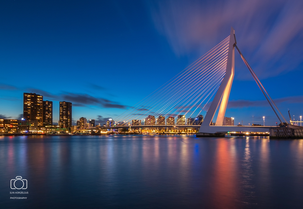 De Erasmusbrug heeft oranje verlichting in het kader van Koningsdag.