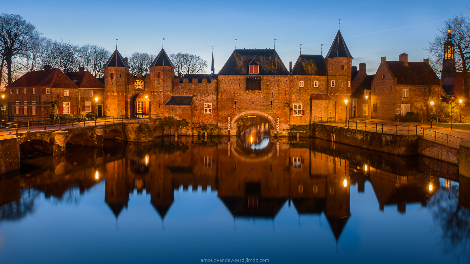 Ijskoude, maar zeer mooie omstandigheden tijdens het blauwe uurtje bij de Koppelpoort in Amersfoort.
