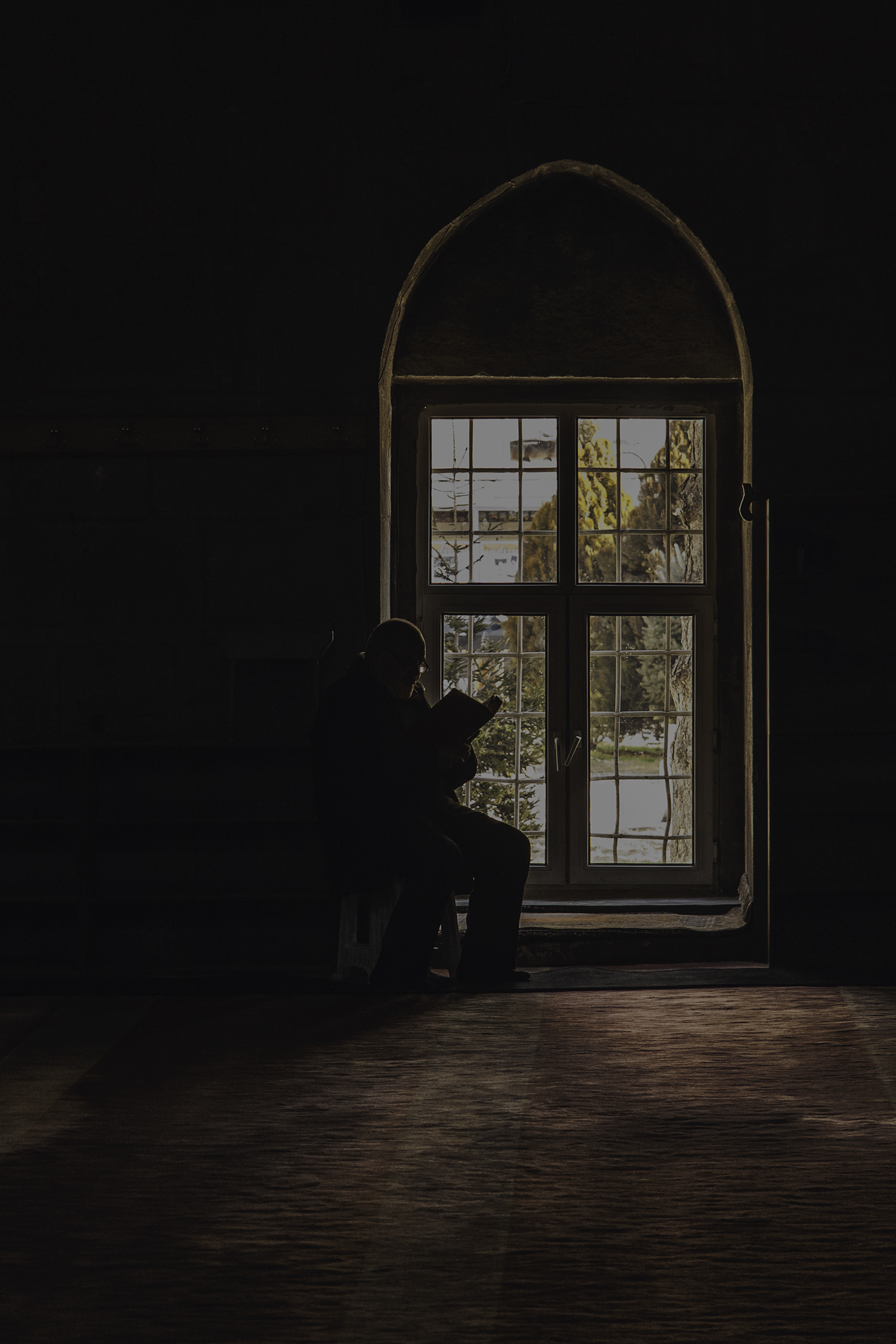 Snapshot in moskee bij tegenlicht, waarbij de details van de man en zijn bezigheid zijn waar te nemen