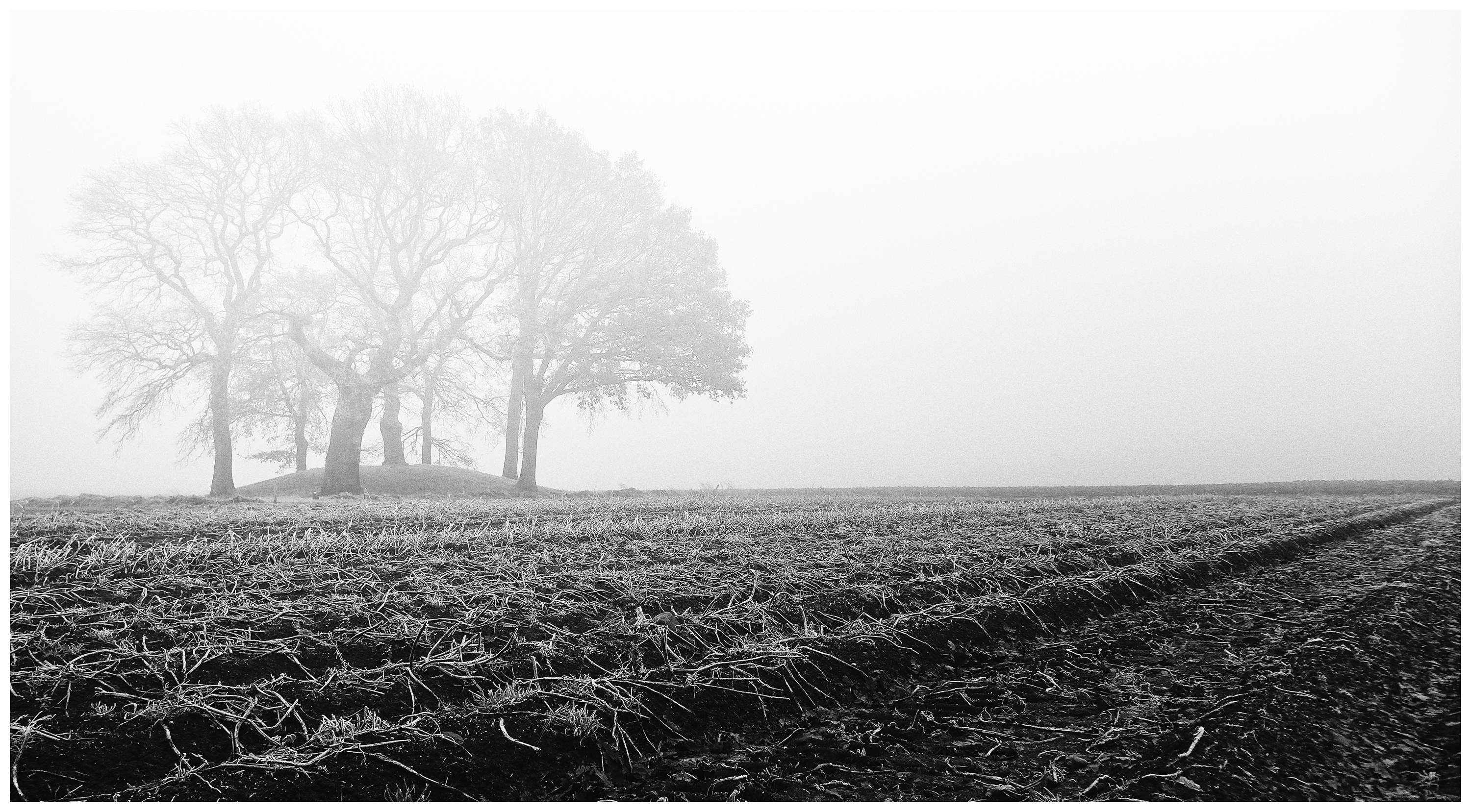 Een grafheuvel in een aardappelland, mist en vorstig weer.