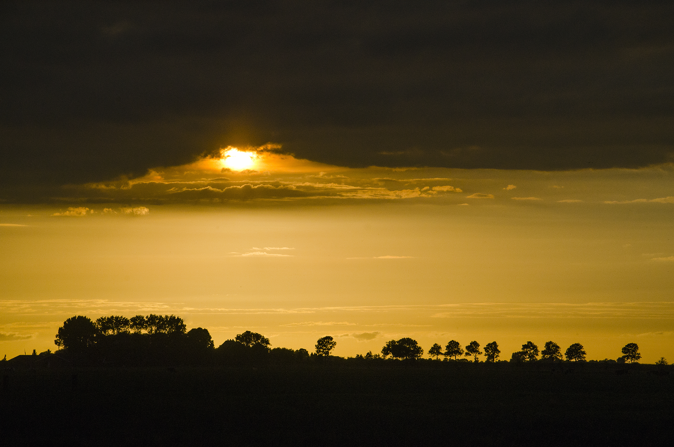 Ondergaande zon over het Gronings wierdenlandschap. Wolken en land in lijn in met elkaar.