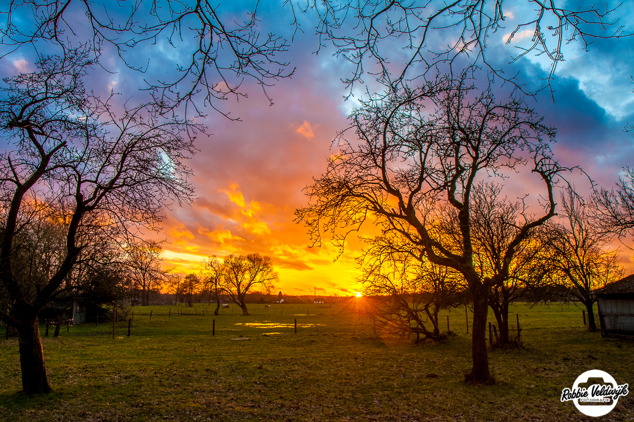 Het voordeel van landelijk wonen is dat ik bij een mooie zonsondergang niet ver hoef te lopen voor het maken van een foto. Wat was het gisteren weer prachtig!