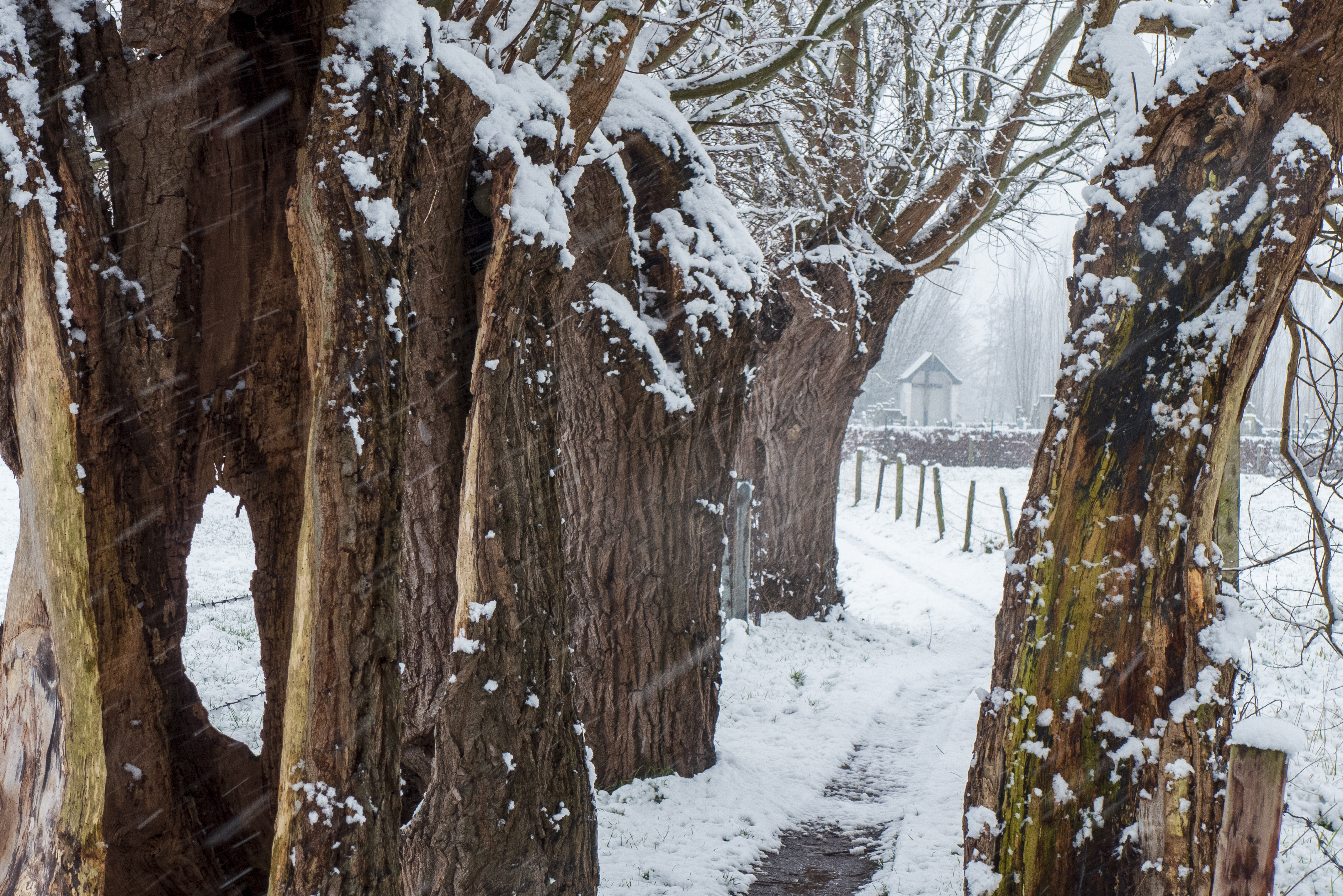 De oude knotwilgen zien af in dit gure sneeuwweer. Toch is het fijn wandelen doorheen de dorpswegeltjes