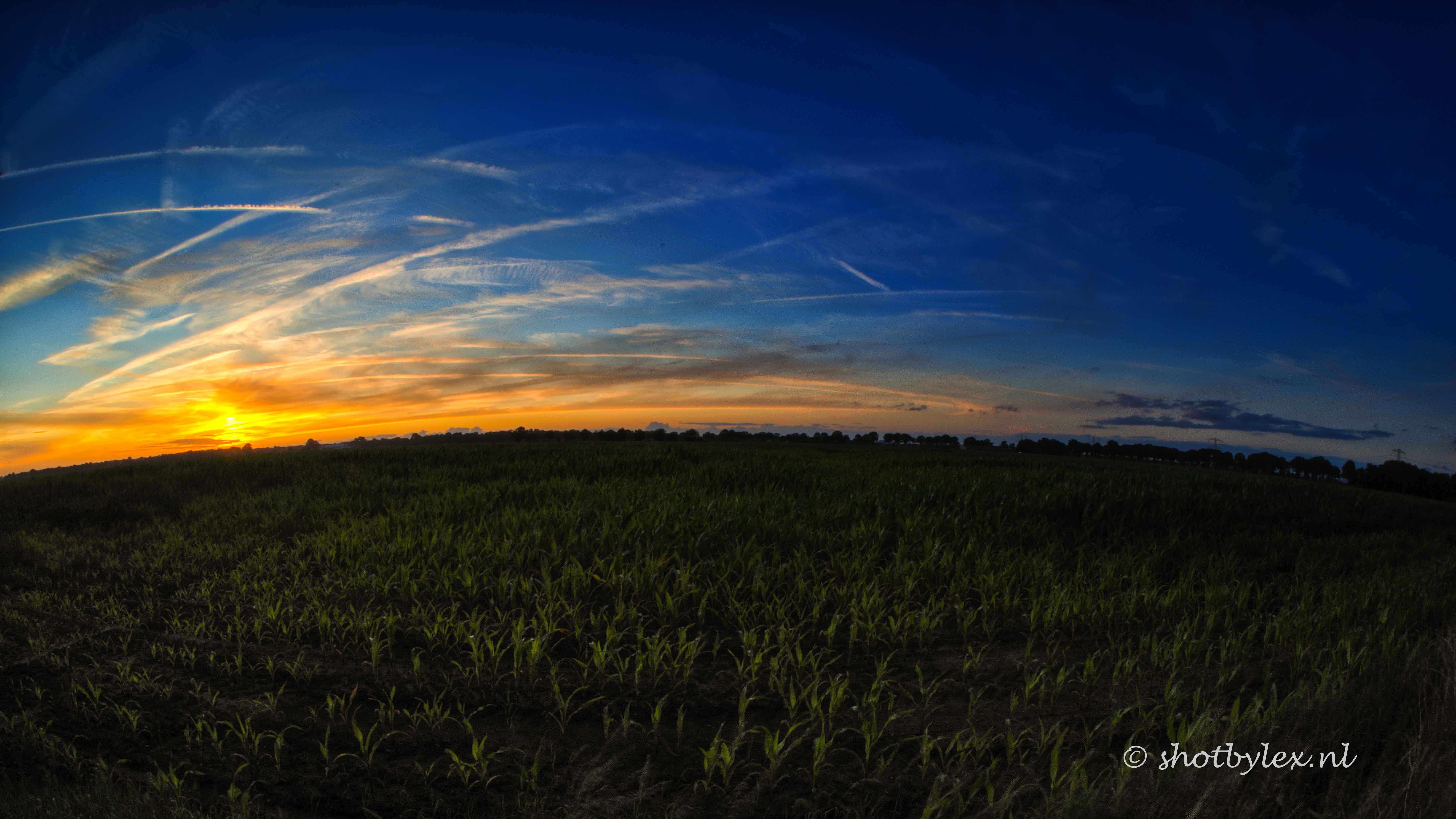 Met een fisheye lens een maisveld in om de laatste kleuren van de dag vast te leggen...