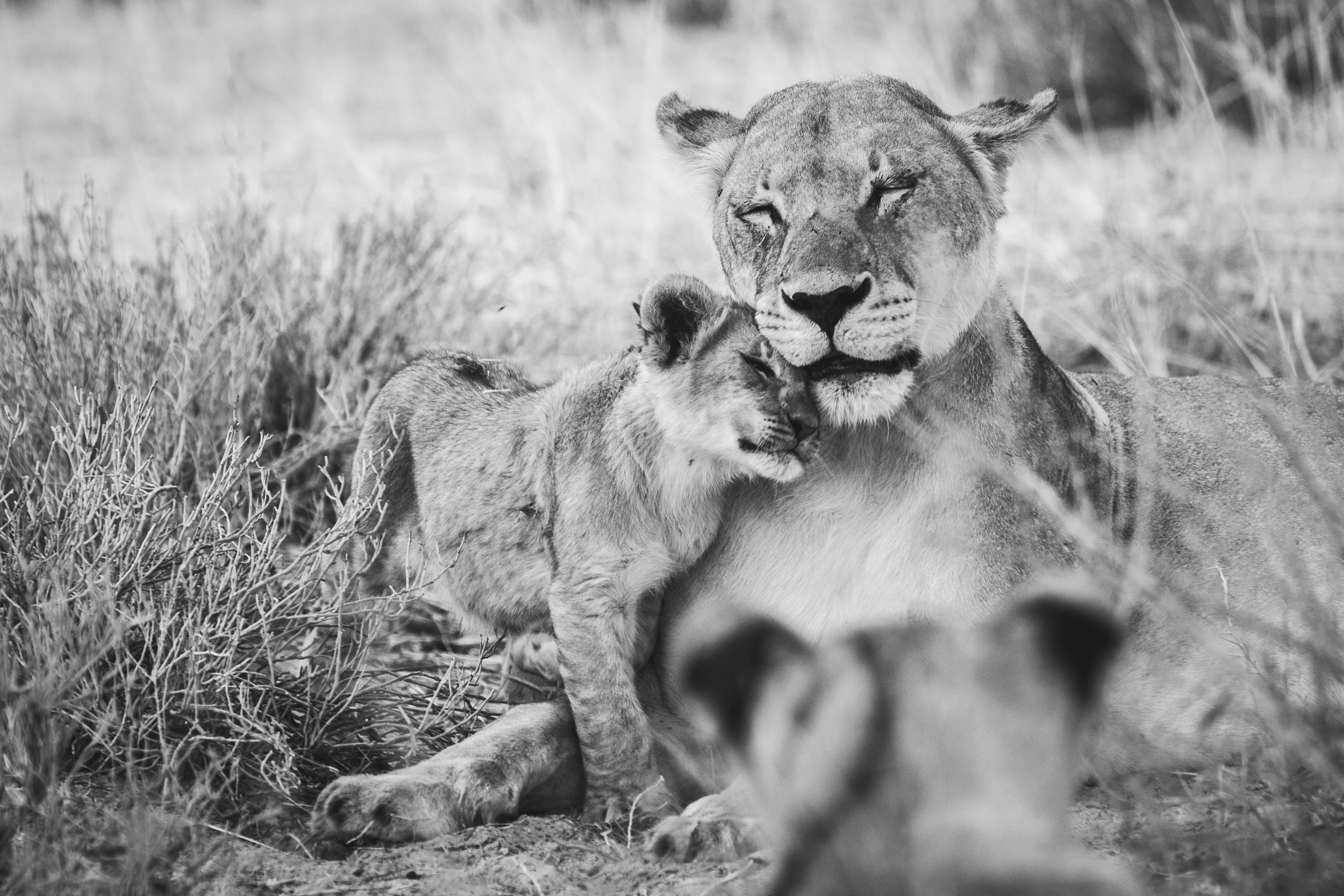 Leeuwin knuffelt met een van haar welpen, in de voorgrond staat een andere welp ernaar te kijken. Gefotografeerd in Kgalagadi Transfrontier Park in Zuid-Afrika.