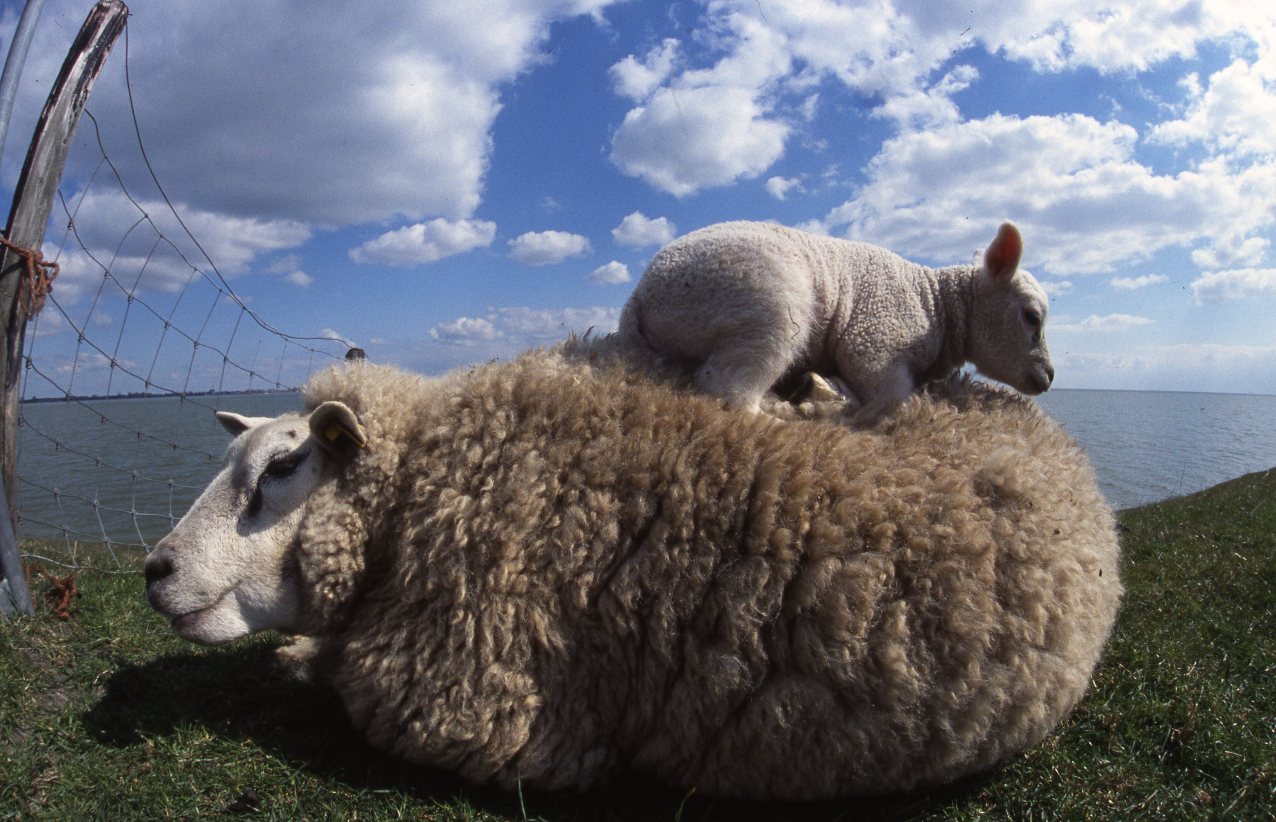 minolta9xi met fische lens,foto gemaakt liggend in het gras, voor ook mooie wolken partij erachter en de dijk erop,schaap ging voor mij op de grond liggen en het lammetje klom op de rug,was voor mij uniek!
