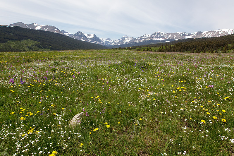 Een landschap in de lente in Amerika. Op de voorgrond een weide met lentebloemen in de achtergrond de bergtoppen van Glacier National Park in USA.