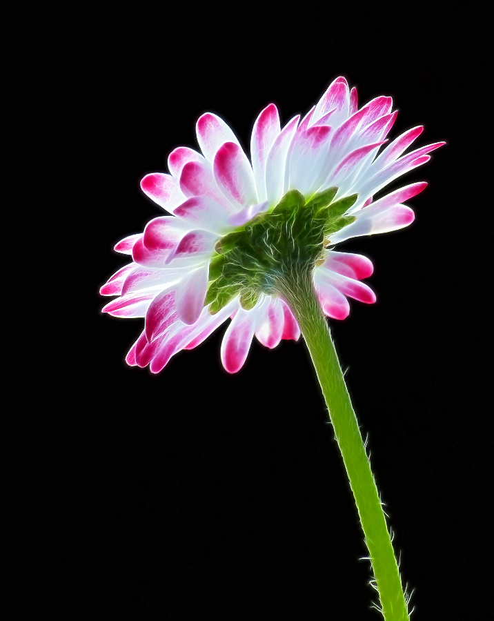 De schaduwrijke achtergrond en het door de zon belichte kleurrijke Madeliefje maakt dit contrastrijke beeld.