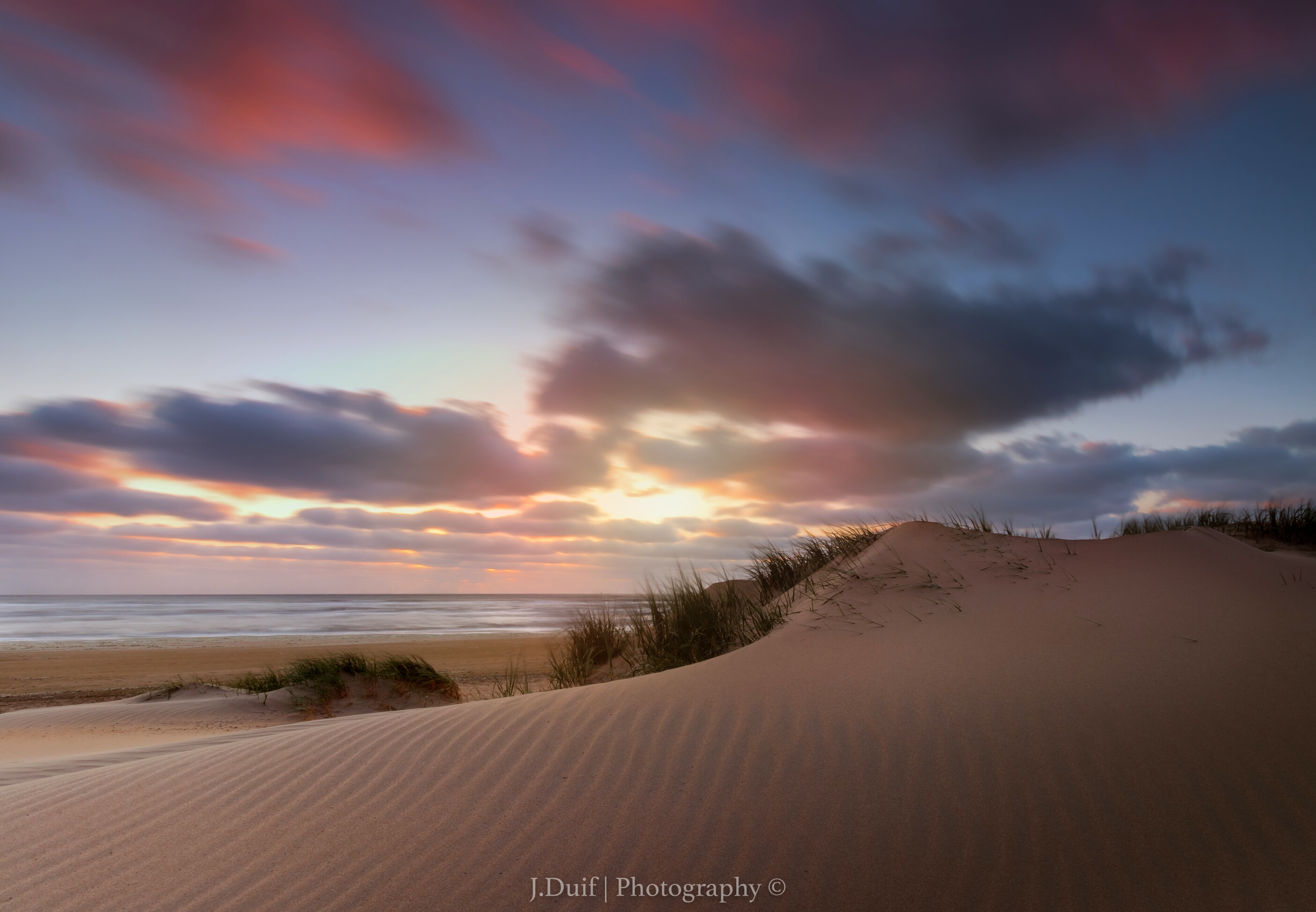 Het Noordwijkse strand tijdens zonsondergang. Harde wind zorgde voor veel dynamiek in de lucht.