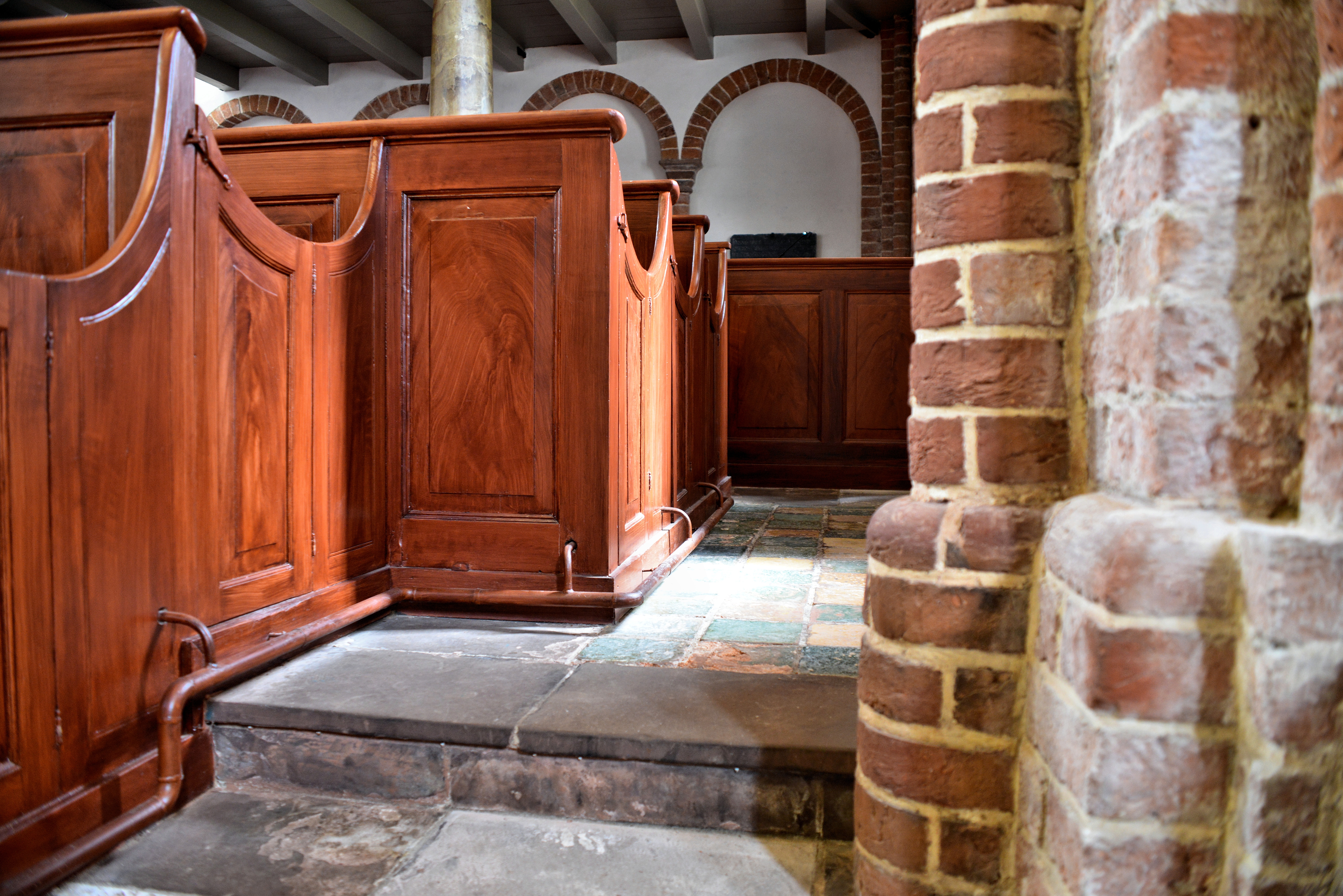 Kerkbanken van de kerk in Garmerwolde. De kerk stamt uit het eind van de 13de eeuw en bevat veel oude schilderingen en prachtige stenen.