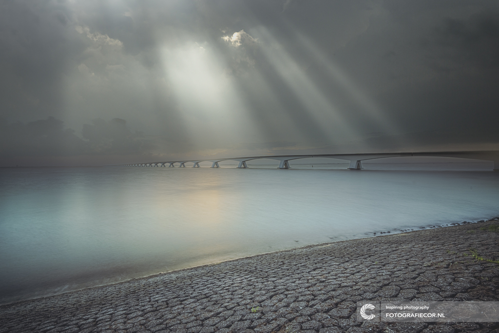 Zeelandbrug, Oosterschelde, lange sluitertijd, landschapsfotografie, deltawerken, brug Nederland, dramatische lucht, jacobsladders, lichtstralen, water, minimalistisch landschap, natuurverschijnsel, fotografie Nederland, weerfotografie, zwartgrijze luchten, reflectie, sfeerbeeld, serene fotografie,