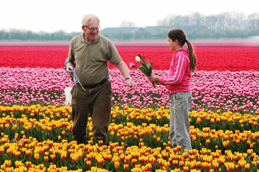 April 2011. We kwamen op onze weg naar huis langs deze bloembollenvelden op Goeree Overflakkee. De man is mede-eigenaar van deze bloemen velden en haalt de bv rode tulp tussen de gele uit, die worden vernietigd omdat ze in de verkeerde rij staan. Hij vertelt met passie over de tulpen. Ik kreeg spontaan een bos tulpen (de geel met rode waar hij tussen staat, en die Mickey Mouse heten) Het meisje plukte de "verkeerde" tulpen, ze had al een boeketje voor haar mama geplukt en nu was ze een bosje voor haar juf aan het plukken. Hier geeft de man haar ook nog een paar tulpen. Wat een lief gebaar! De tulpen zijn er volgende week nog, maar dan zonder bloem, die worden volgende week "onthoofd" want dan kan de bol beter groeien. Ik was net op tijd!